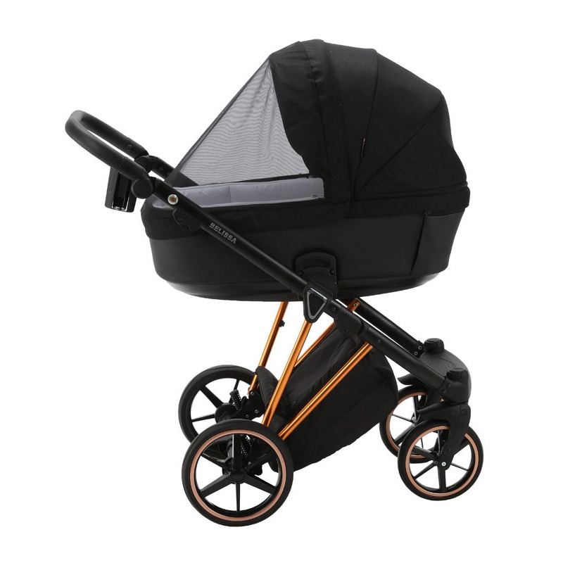 Gondola wózka Adamex Belissa jest przestronna i wygodna. Wpinanie na stelaż jest szybkie i wygodne za pomocą przycisków pamięci. Dno gondoli jest wentylowane, a wysokość oparcia regulowana. Rozsuwany panel wentylacyjny z przodu zapewnia odpowiednią cyrkulację powietrza w upalne dni. We wnętrzu gondoli znajduje się przewiewny materacyk kokosowy przyjazny dla środowiska i bezpieczny dla dziecka. Duża budka z daszkiem przeciwsłonecznym osłania dziecko przed słońcem, wiatrem i deszczem. Okrycie gondoli ma podwyższany kołnierz z okienkiem wentylacyjnym. Nieużywana jest łatwa w złożeniu na płasko.