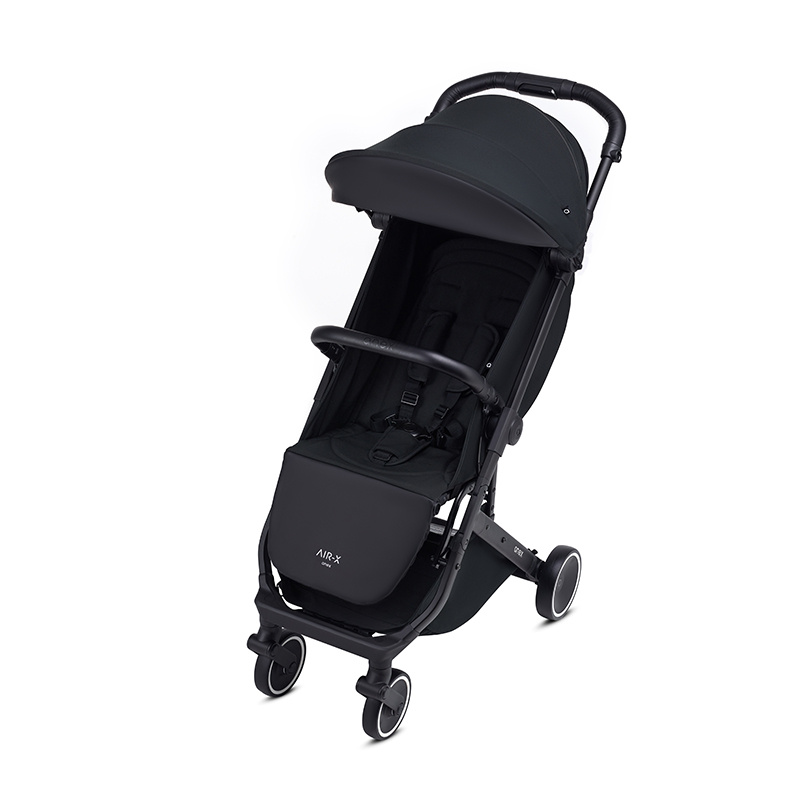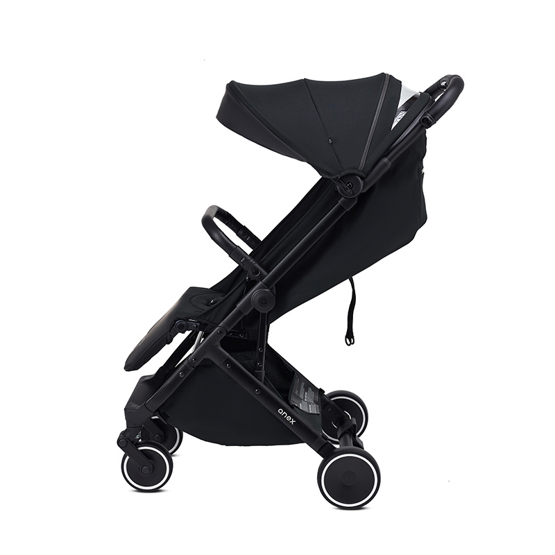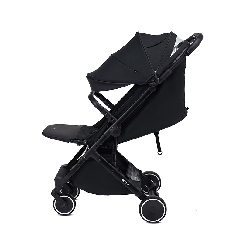 Anex Air-X, kompaktowy miejski wózek spacerowy. Przeznaczony dla dzieci od urodzenia do maksymalnej wagi 22 kg. Składa się bardzo łatwo i szybko przy użyciu jednej ręki do małych rozmiarów a funkcja X-Lock automatycznie zabezpiecza przed przypadkowym złożeniem stelaża. W połączeniu z dodatkowym pokrowcem transportowym można go zabrać jako bagaż podręczny. Wózek wyposażony jest w małe zwrotne kółka z systemem Anti-Wobble, zapobiegającym drganiom kół podczas ruchu wózka i zapewnia prostą i płynną jazdę. Są wykonane z wysokiej jakości pianki, odpornej na przebicia. Dodatkowo każde koło jest amortyzowane, a pokonywanie trudniejszych terenów nie jest przeszkodą. Hamulec Comfy Stop aktywowany i wyłączany naciśnięciem jest przyjazny dla obuwia. Koszyk na zakupu pomieści wszystkie niezbędne akcesoria podczas spaceru. Wyjmowany obustronnie pałąk pokryty ekoskórą znajduje się w zestawie.