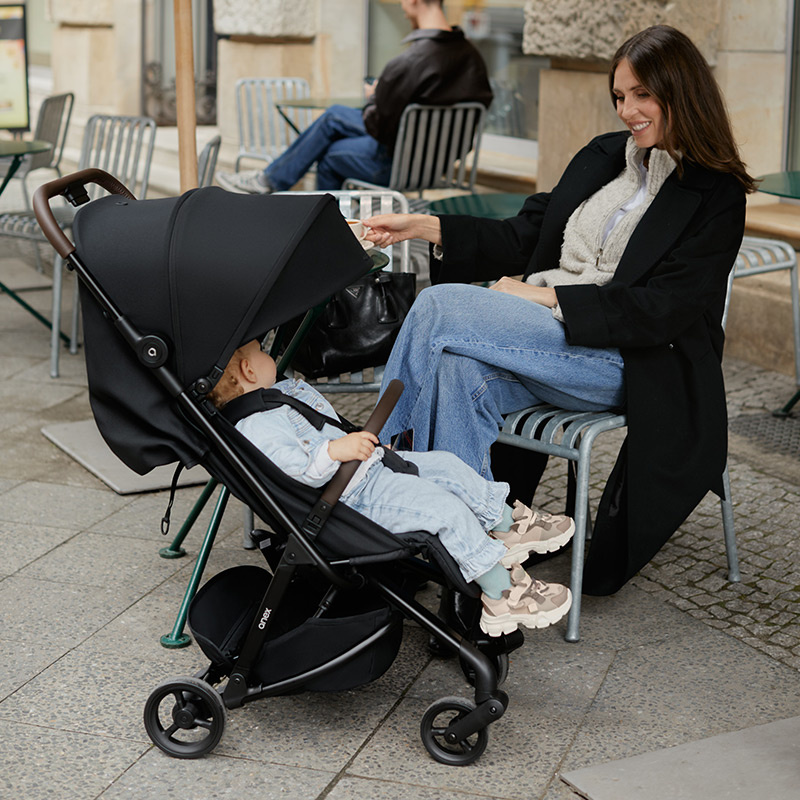 Siedzisko Anex Air-Z Plus jest obszerne i zostało zaprojektowane z myślą o wygodzie podczas codziennych spacerów. Oparcie rozkłada się płynnie do pozycji leżącej, a regulowany podnóżek pomaga lepiej dopasować ustawienie do aktualnych potrzeb dziecka. Pasy bezpieczeństwa z miękkimi nakładkami stabilnie podtrzymują malucha, a specjalna poduszka wspiera głowę i szyję. Duża budka z filtrem UPF 50+ pomaga osłonić dziecko przed słońcem i wiatrem, a dodatkowy daszek przeciwsłoneczny zwiększa ochronę w cieplejsze dni.