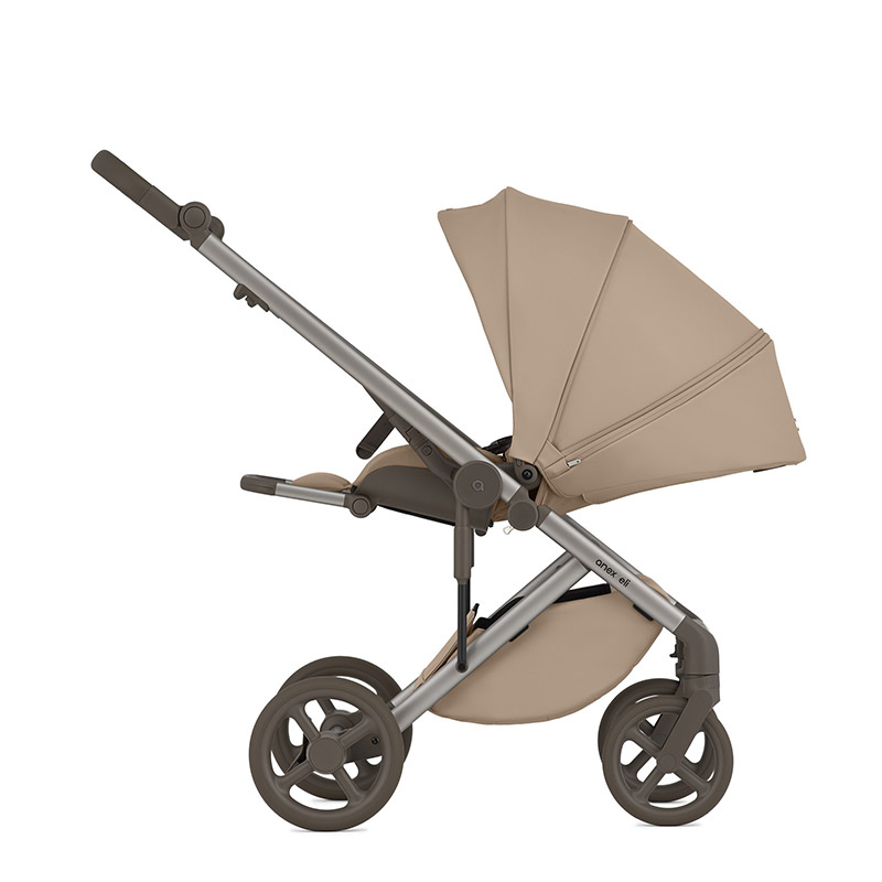 Wózek dziecięcy Anex ELI 2w1 z gondolą w kolorze beżowym podczas spaceru w terenie miejskim