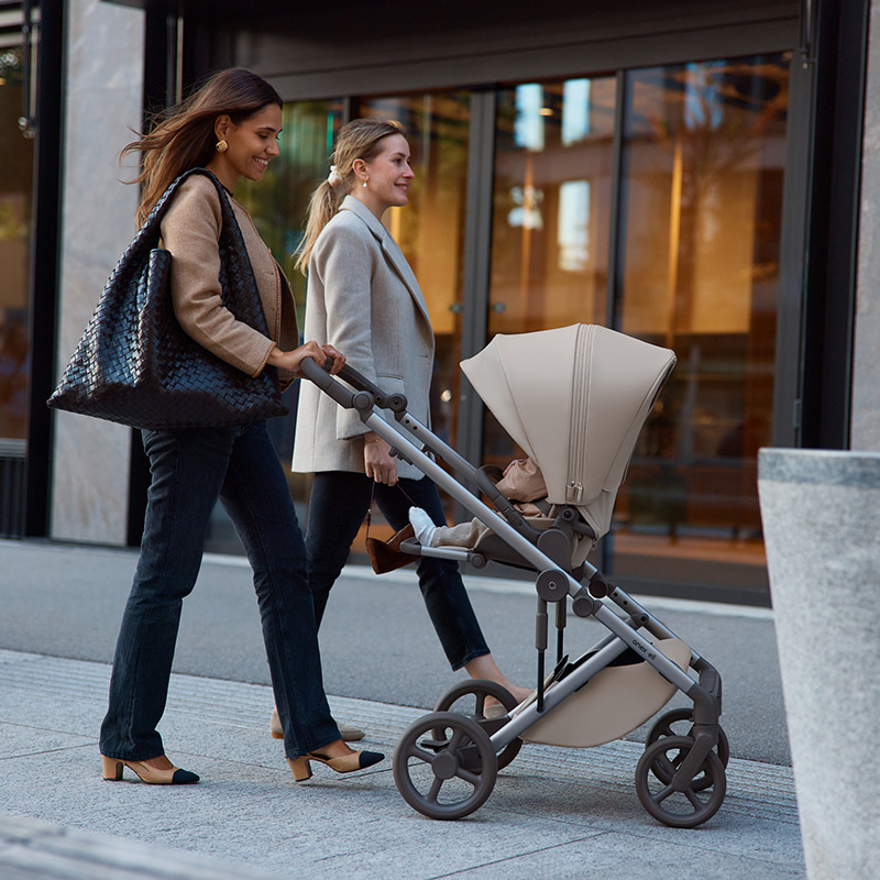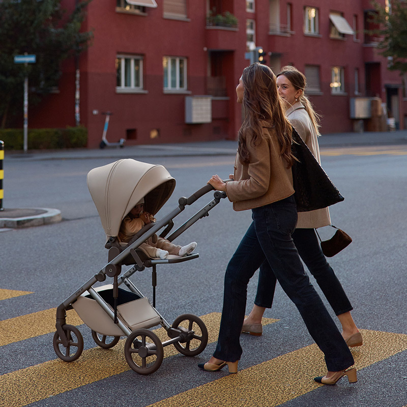 Wózek dziecięcy Anex ELI 2w1 z gondolą w kolorze beżowym podczas spaceru w terenie miejskim
