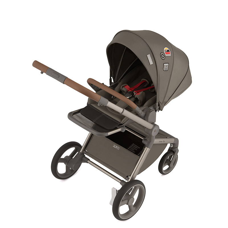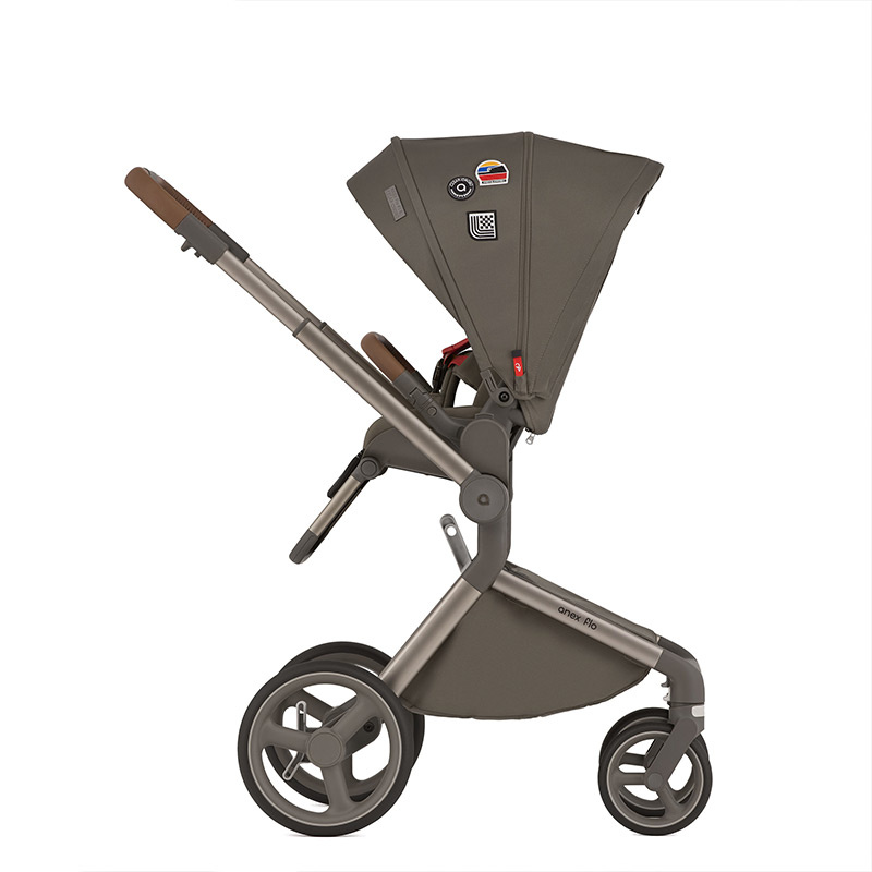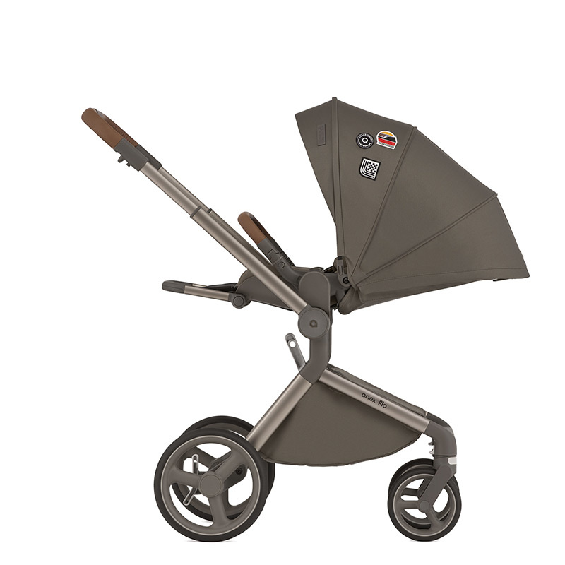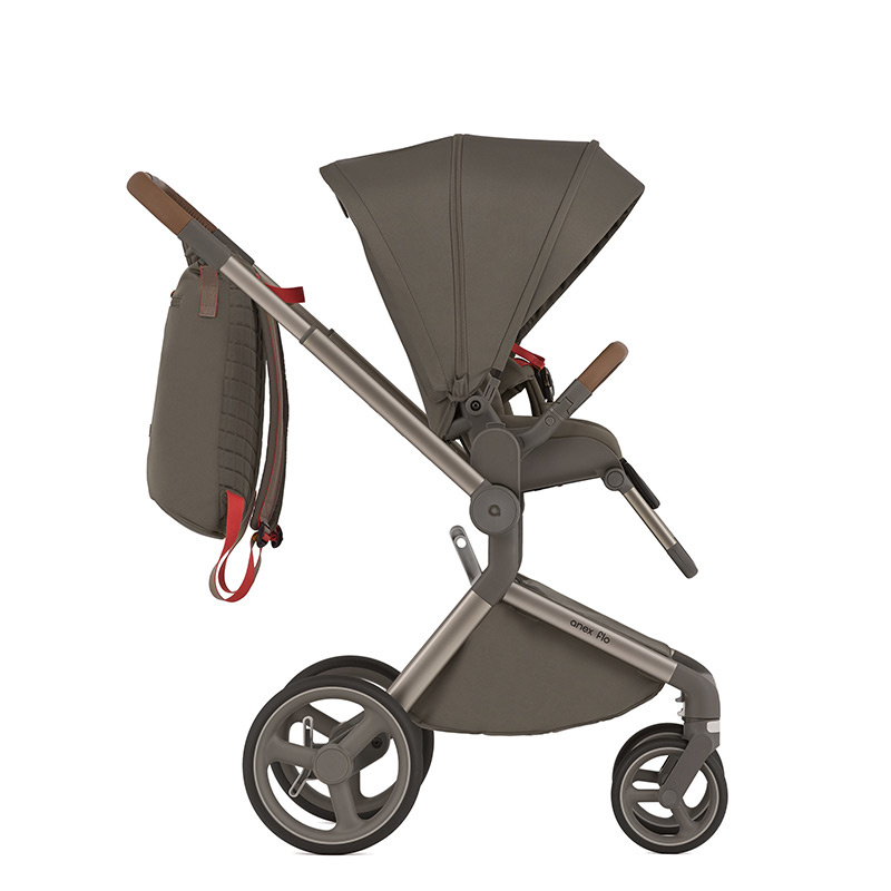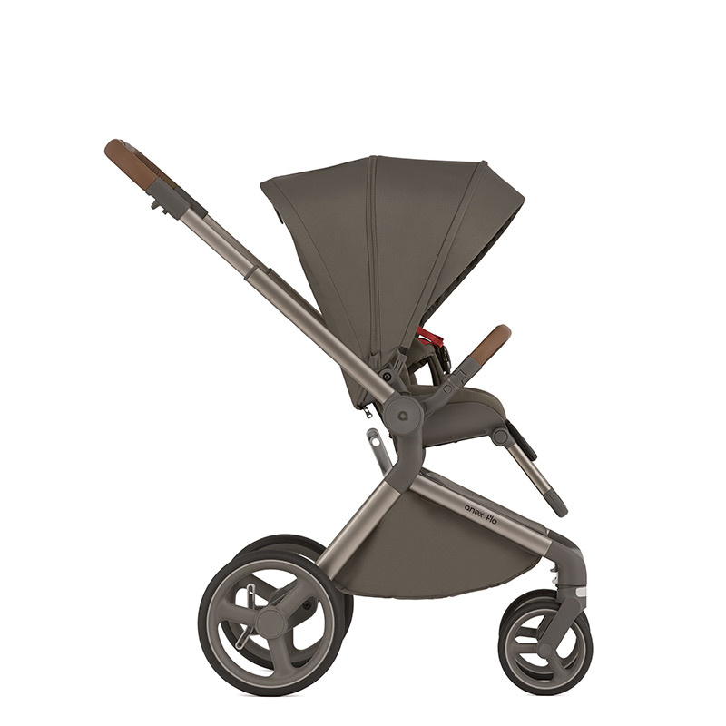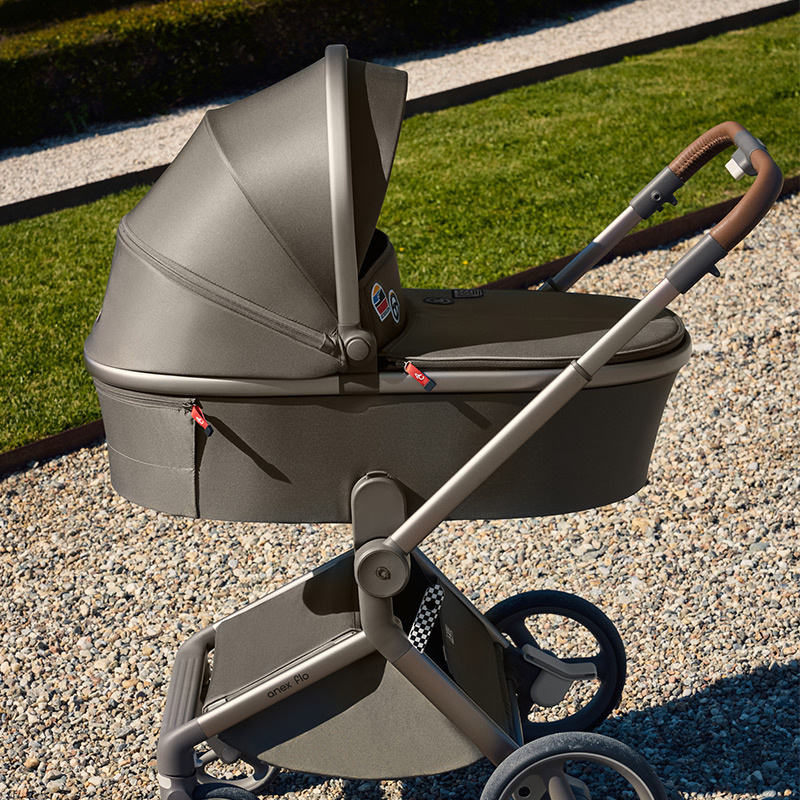 Siedzisko spacerowe wózka Anex Flo jest duże i wygodne. Może być zamontowane na stelażu w obu kierunkach, przodem lub tyłem do rodzica. Dla zwiększenia wygody rodzica siedzisko można zamontować na dołączonych adapterach podwyższających. Dzięki temu zyskujemy dodatkowe 8,5 cm. Zdejmowanie siedziska jest proste i szybkie dzięki przyciskom memory. Aby złożyć wózek z siedziskiem, nie trzeba go wypinać ze stelaża. Oparcie wraz z podnóżkiem jest regulowane w kilku pozycjach, do pozycji leżącej włącznie. W trakcie drzemki zapewnia dziecku komfortową przestrzeń o łącznej długości 90 cm. 5-punktowe pasy wewnętrzne z miękkimi nakładkami na ramiona i biodra utrzymują dziecko w bezpiecznej i wygodnej pozycji przez cały czas. Same pasy są regulowane i zapinane magnetyczną klamrą. Duża budka z filtrem UPF50+ ma możliwość powiększenia o daszek przeciwsłoneczny oraz dodatkowy, rozsuwany panel. Ostatnia część panelu budki ma wszytą pod spodem siateczkę, wystarczy ją odsłonić, aby zapewnić optymalną cyrkulację powietrza w gorące dni. Takie rozwiązania skutecznie chronią dziecko przed warunkami pogodowymi o każdej porze roku. Odpinany pałąk, pokryty ekoskórą zabezpiecza dziecko przed wypadnięciem.