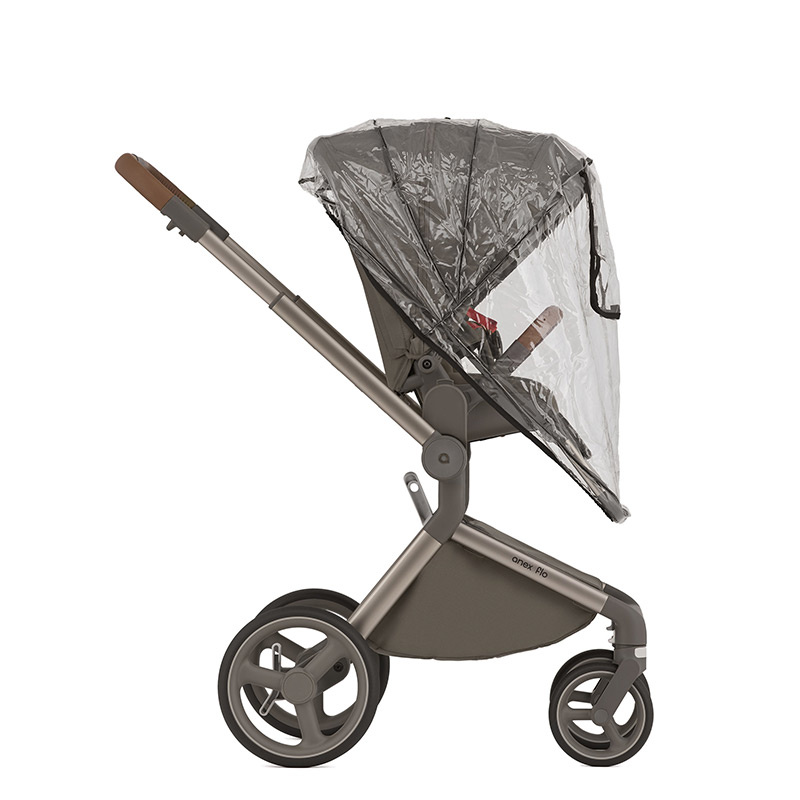 W zestawie z wózkiem Anex Flo znajdują się: pałąk, folia przeciwdeszczowa, moskitiera oraz adaptery podwyższające.