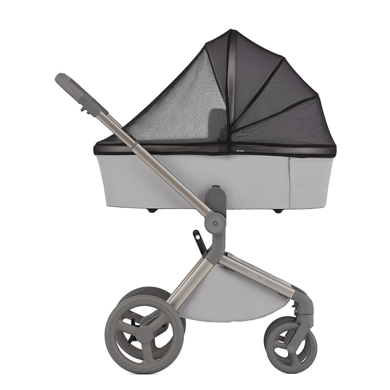 W zestawie z wózkiem Anex Flo znajdują się: pałąk, folia przeciwdeszczowa, moskitiera oraz adaptery podwyższające.