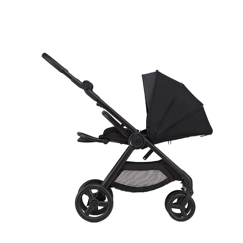 Siedzisko spacerowe iQ zestawu 2w1 jest duże i wygodne. Montowane jest na stelażu wózka w obu kierunkach, przodem i tyłem do kierunku jazdy. Oparcie jest regulowane stopniowo, do pozycji leżącej. Regulowany podnóżek we współpracy z siedziskiem wydłuża powierzchnię do snu i zapewnia dziecku spokojny odpoczynek w trakcie spacerów. 5-punktowe pasy z miękkimi otulinkami można dostosować do aktualnego wzrostu dziecka. Duża budka z dodatkowym rozsuwanym panelem chroni dziecko przed wiatrem, deszczem i słońcem. Daszek przeciwsłoneczny przyda się w upalne dni. Pałąk pokryty ekoskórą dodatkowo zabezpiecza dziecko przed wypadnięciem.