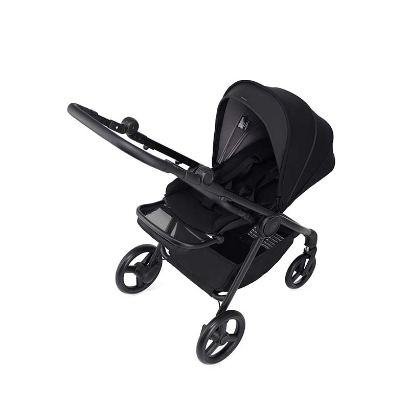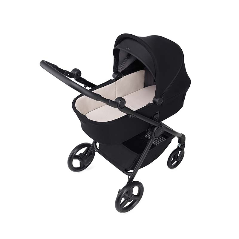 Wózek przeznaczony jest dla dziecka od urodzenia do maksymalnej wagi 22 kg. Innowacyjny stelaż jest lekki i kompaktowy, waży jedynie 6 kg. Składa się na płasko przy użyciu jednej ręki, a w wersji spacerowej zestawu 2w1 razem z siedziskiem zamontowanym w obu kierunkach. Nowoczesny system amortyzacji sprawia, że każda podróż, w każdej konfiguracji będzie przyjemna i komfortowa. Dwa zestawy kół, mniejsze i większe pomogą dostosować podwozie do własnych potrzeb i terenu. Przednie koła są skrętne z możliwością zablokowania do jazdy na wprost w położeniu przodem lub tyłem. Brak poprzecznej barierki łączącej tylną oś zapewnia więcej miejsca na na nogi rodzica i przeciwdziała "kopaniu" wózka w trakcie spacerów. Hamulec typu click-click umieszczony jest przy prawym kole. Kosz o pojemności do 5 kg pomieści wszystkie niezbędne akcesoria i zakupy. Rączka pokryta ekoskórą jest regulowana.