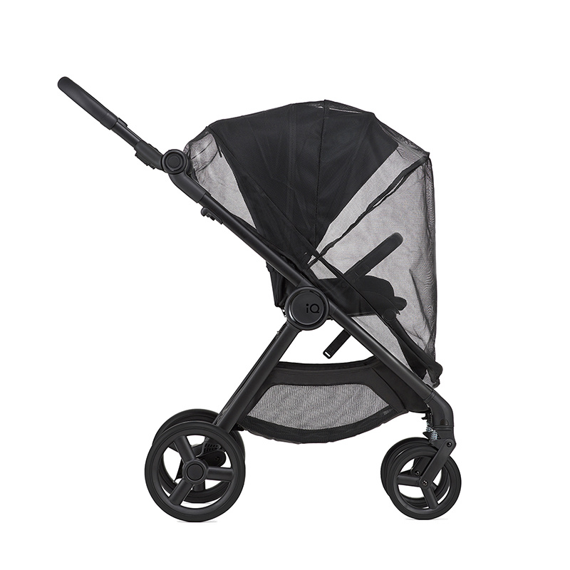 Gondola iQ jest lekka i przestronna (waży jedynie 3,7 kg). W zestawie znajduje się miękki materacyk, zapewniający komfort dziecku już od pierwszych dni życia. Obszerna budka z daszkiem przeciwsłonecznym ma możliwość powiększenia i rozsuwany panel. Możemy go do dodatkowo podwinąć, odkrywając siateczkę. Razem z przednim, siateczkowym panelem w ścianie gondoli zapewnia odpowiednią cyrkulację powietrza w ciepłe dni. Osłonka na nóżki zabezpieczy dziecko przed wiatrem i chłodem.
