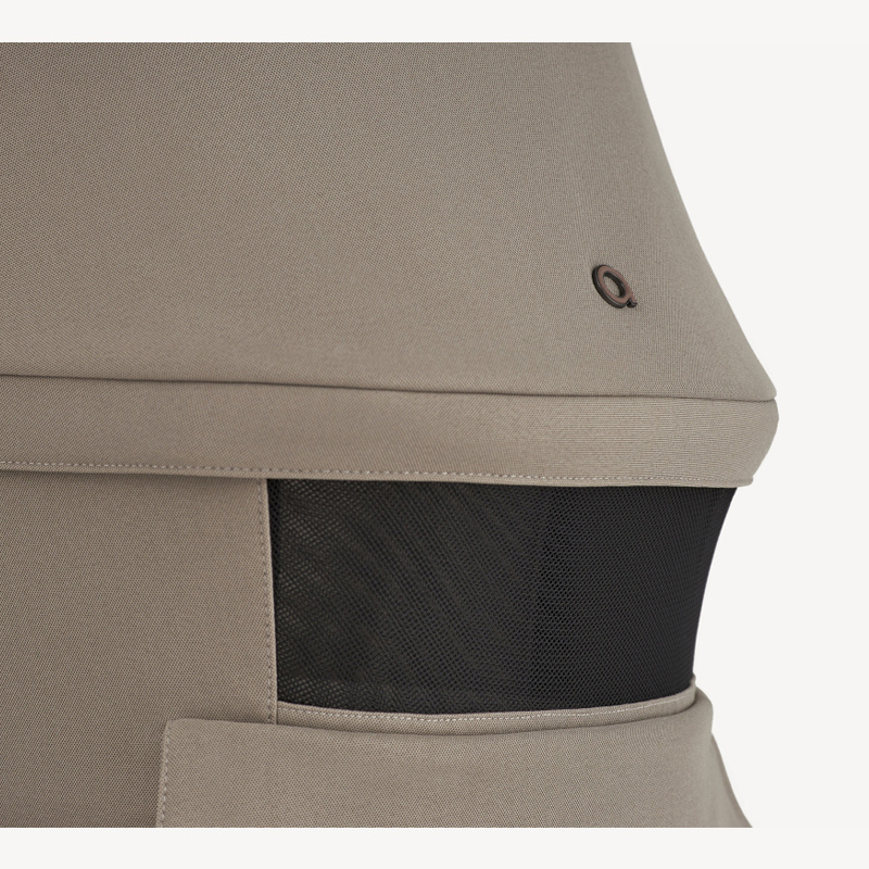 Gondola iQ jest lekka i przestronna (waży jedynie 3,7 kg). W zestawie znajduje się miękki materacyk, zapewniający komfort dziecku już od pierwszych dni życia. Obszerna budka z daszkiem przeciwsłonecznym ma możliwość powiększenia i rozsuwany panel. Możemy go do dodatkowo podwinąć, odkrywając siateczkę. Razem z przednim, siateczkowym panelem w ścianie gondoli zapewnia odpowiednią cyrkulację powietrza w ciepłe dni. Osłonka na nóżki zabezpieczy dziecko przed wiatrem i chłodem. Nieużywaną gondolę można złożyć do bardzo kompaktowych rozmiarów (na płasko i wpół)