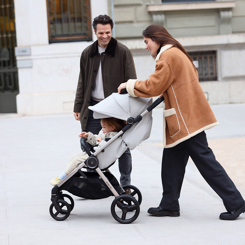 Wózek przeznaczony jest dla dziecka od urodzenia do maksymalnej wagi 22 kg. Innowacyjny, anodowany stelaż w wersji premium jest lekki i kompaktowy, waży jedynie 6 kg. Składa się na płasko przy użyciu jednej ręki, a w wersji spacerowej zestawu 2w1 razem z siedziskiem zamontowanym w obu kierunkach. Nowoczesny system amortyzacji sprawia, że każda podróż, w każdej konfiguracji będzie przyjemna i komfortowa. Dwa zestawy kół, mniejsze i większe pomogą dostosować podwozie do własnych potrzeb i terenu. Przednie koła są skrętne z możliwością zablokowania do jazdy na wprost w położeniu przodem lub tyłem. Brak poprzecznej barierki łączącej tylną oś zapewnia więcej miejsca na na nogi rodzica i przeciwdziała "kopaniu" wózka w trakcie spacerów. Hamulec typu click-click umieszczony jest przy prawym kole. Kosz o pojemności do 5 kg pomieści wszystkie niezbędne akcesoria i zakupy. Rączka pokryta ekoskórą jest regulowana.