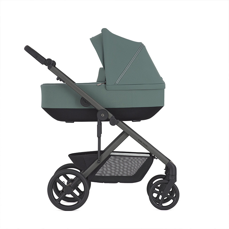Anex Modu przeznaczony jest dla dzieci od urodzenia do maksymalnej wagi 22 kg na każde siedzisko (w wersji podwójnej 2x22kg). Jest jednym z najwęższych wózków w tej kategorii, dzięki czemu bez problemu mieści się w wąskich przestrzeniach. Stelaż składa się na płasko wraz z wpiętym siedziskiem spacerowym, a po złożeniu stoi samodzielnie. Wózek posiada wysokiej jakości piankowe koła Flexi, odporne na zużycie i gwarantujące płynną jazdę. Przednie koła są skrętne z możliwością zablokowania do jazdy na wprost, dzięki czemu pokonywanie przeszkód na spacerze jest niezwykle proste. Dobry system amortyzacji umieszczony na ramie wózka oraz przednich kołach zapewnia dziecku stabilność i komfort podczas jazdy. Duży koszyk z łatwym dostępem i udźwigiem do 10 kg pomieści zakupy i akcesoria niezbędne na spacerze. Łamana rączka pokryta ekoskórą ma możliwość regulacji wysokości w zależności od potrzeb. Hamulec umieszczony przy prawym kole działa szybko na zasadzie jednego naciśnięcia i nie niszczy butów. Wypinany obustronnie pałąk zapewnia dziecku bezpieczeństwo.