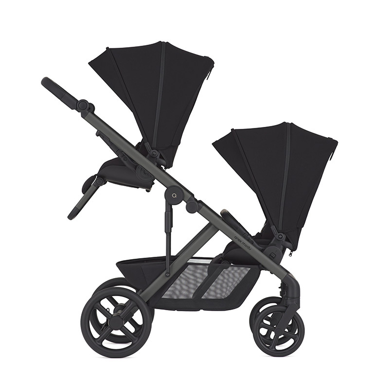 Anex Modu, kompaktowy bliźniaczy wózek spacerowy rok po roku. W zestawie znajduje się stelaż z siedziskiem spacerowym oraz dodatkowym siedziskiem dla drugiego dziecka.
