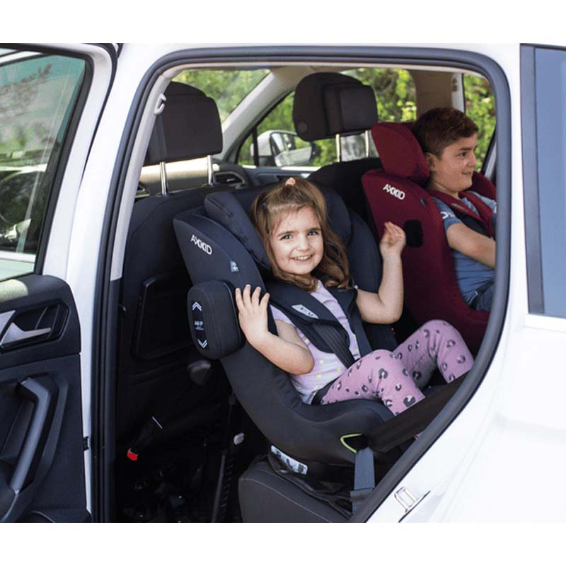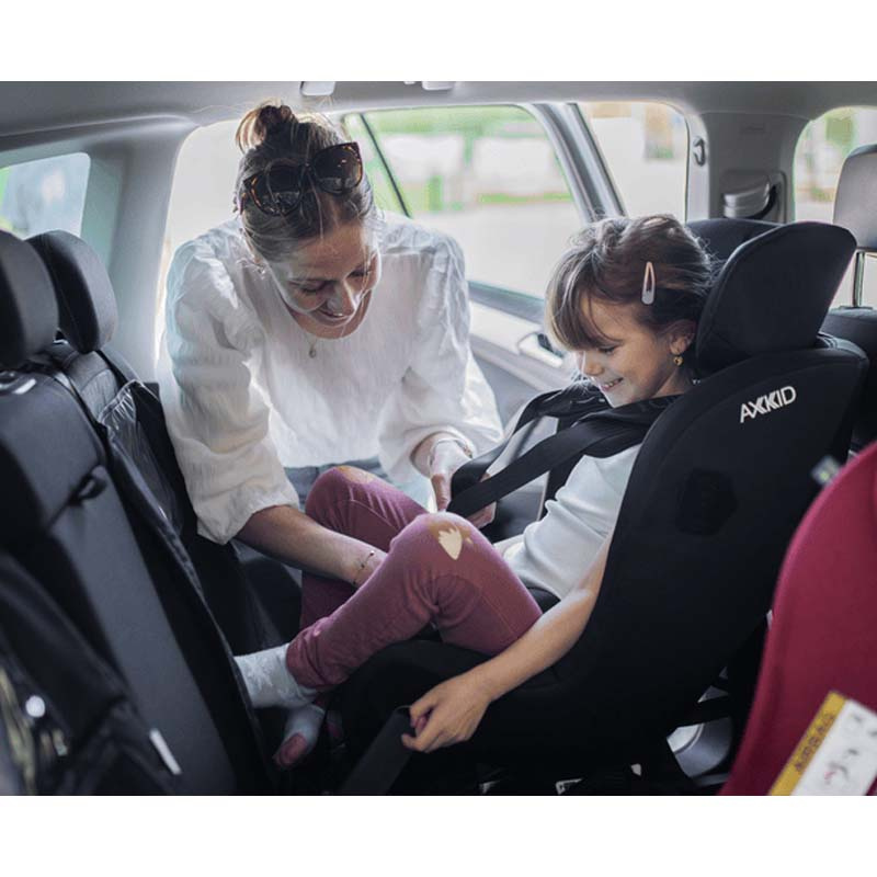 Axkid Minikid 4 montowany jest tyłem do kierunku jazdy, przez cały okres użytkowania, zapewniając przez ten czas maksimum bezpieczeństwa. 3-punktowy pas samochodowy, noga stabilizująca oraz dodatkowe boczne pasy kotwiczące gwarantują stabilny montaż. Do fotela dołączona jest specjalna wkładka wypłycająca dla dzieci pomiędzy 61 a 105 cm wzrostu. Została stworzona z pianki memory i oddychającej tkaniny z siateczką. Kompaktowa konstrukcja Minikida 4 pozwala na sprawny montaż nawet w mniejszych samochodach, zachowując przy tym dużo miejsca dla dziecka. Dodatkowe 30 cm przestrzeni na nogi dziecka gwarantuje komfortową podróż. W fotelu zastosowano technologię dynamicznego zagłówka automatycznie dostosowującą jego wysokość do aktualnego wzrostu dziecka. Sam zagłówek można regulować oddzielnie w 14 dostępnych pozycjach. Minikid 4 ma ergonomiczna pozycję siedzącą, uzupełnioną o system Sleep Well oferujący wiele pozycji półleżących, ułatwiających drzemkę w trakcie podróży.