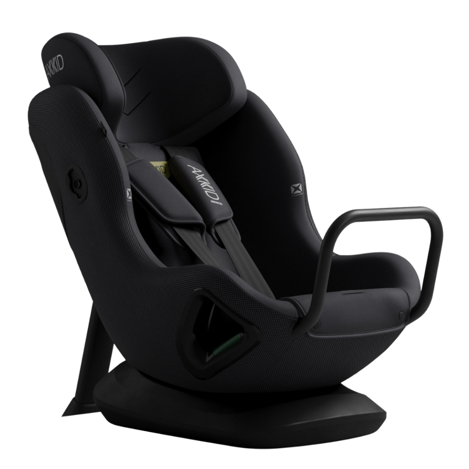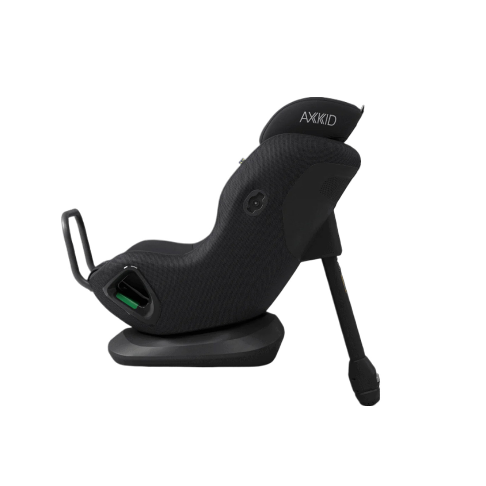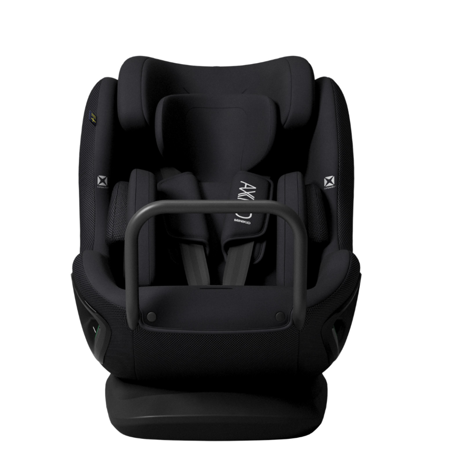 - Fotelik samochodowy Axkid Minikid Core 40–125 cm i do 28 kg, montowany na pas samochodowy, z testem Swedish Plus Test i normą UN R129.