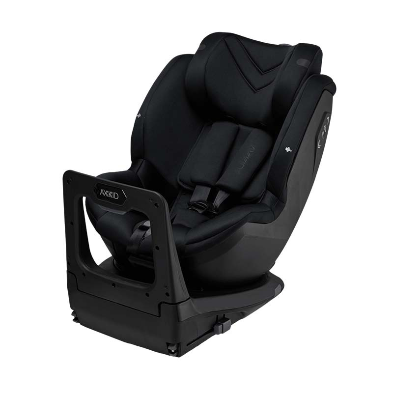 Axkid Spinkid, obrotowy fotelik samochodowy dla najmłodszych. Przeznaczony jest dla dzieci od 40 do 105 cm wzrostu i maksymalnej wagi 18kg. Dzięki dodatkowej wkładce mogą z niego korzystać również noworodki. Montowany jest w samochodzie na zintegrowanej bazie isofix z nogą wspierającą. Zapewnia bezpieczne przewożenie tyłem do kierunku jazdy przez cały okres użytkowania. Regulowana rama antyrotacyjna pozwala na prosty montaż i zapewnia więcej miejsca na nogi dziecka. Pomaga to dziecku w uzyskaniu do 14 cm przestrzeni na nogi, a jednocześnie ułatwia dopasowanie do kształtu kanapy. System obrotu 180º za pomocą jednego przycisku umożliwia rodzicom ustawianie fotela frontem do drzwi wejściowych i szybkie wpięcie dziecka.