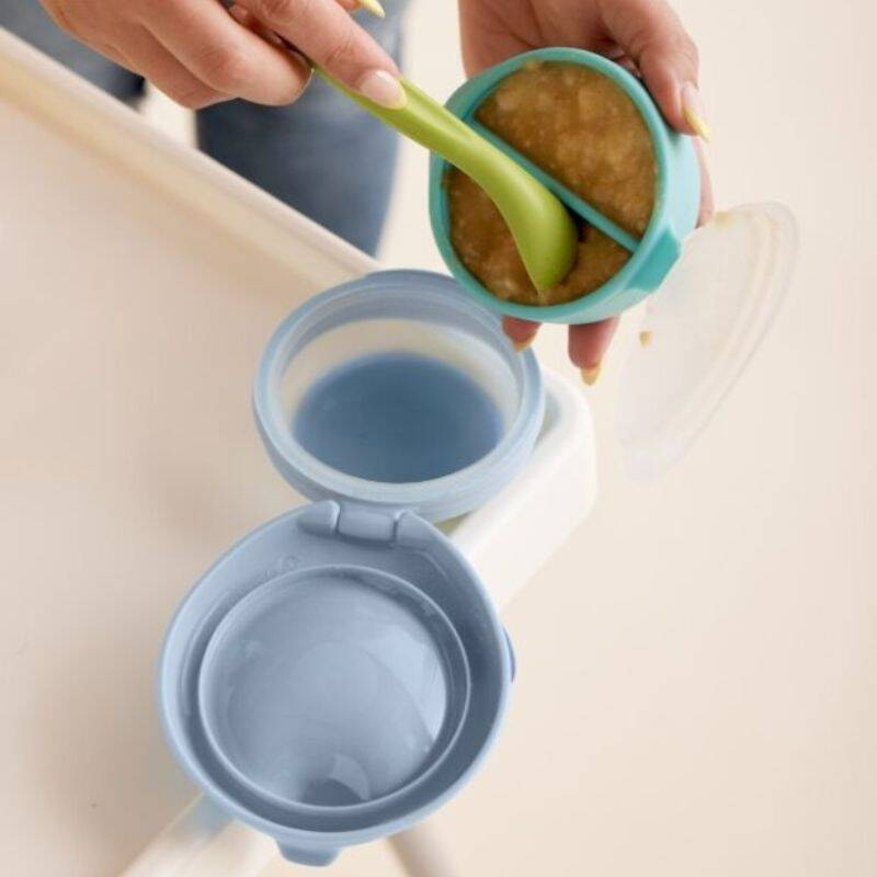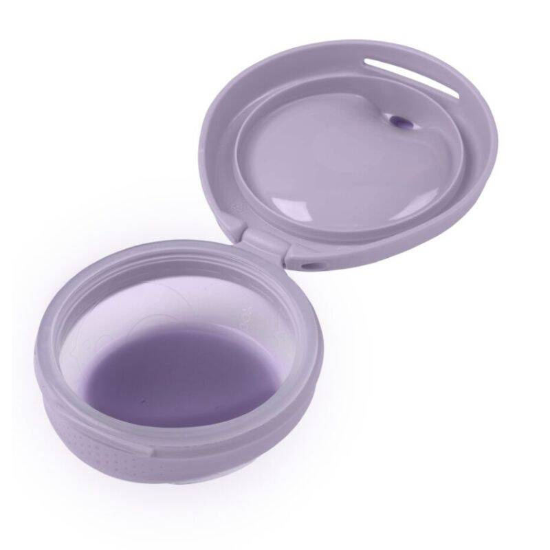 Silikonowa miseczka do karmienia o pojemności 250 ml. Idealne zastosowanie do musów i przecierów. Dzięki specjalnemu ustnikowi umożliwia przyjmowanie pokarmu bez zabrudzeń. Całość jest zabezpieczone pokrywką, a ustnik gumową zaślepką gwarantując szczelność. Elastyczna, silikonowa konstrukcja ułatwia podawanie posiłku przez ściśniecie. Dziecko samo utrzyma miseczkę, ściśnie i intuicyjne będzie ssało końcówkę ustnika. Akcesorium bardzo przydatne w podróży. Można myć w zmywarce i sterylizować. Można używać w kuchence mikrofalowej.