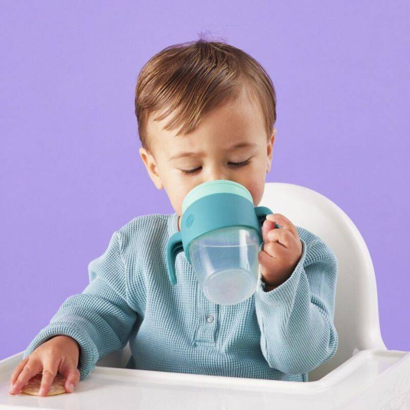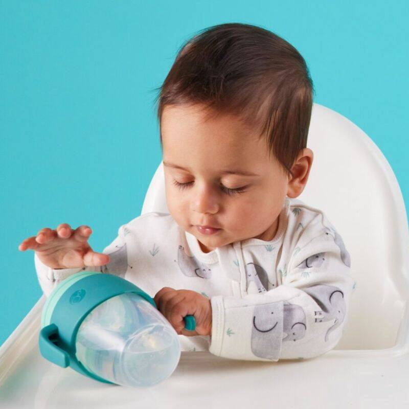 Kubek treningowy dla dziecka o pojemności 250 ml. Przeznaczony dla dzieci od 6 miesiąca życia do momentu, aż będzie pewnie pić z otwartej szklanki. Miękka silikonowa obręcz pod wpływem nacisku pomaga w kontrolowaniu przepływu płynu. Im silniej dziecko ją naciska, tym więcej płynu wypływa. Dzięki temu nauka picia bez słomki jest szybka i wygodna. Obustronne rączki ułatwiają chwytanie i przechylanie kubeczka. Po skończeniu zabawy wystarczy przekręcić rączki w górę i całkowicie zablokować przepływ płynu w środku. Kubek można myć w zmywarce i sterylizować.