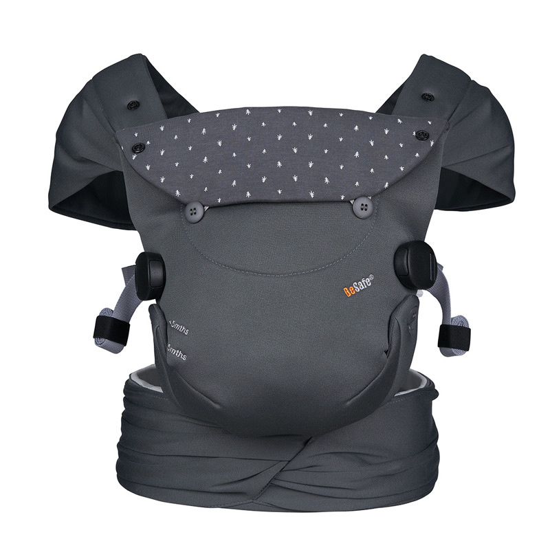 Nosidło niemowlęce BeSafe Newborn Haven . Połączenie ergonomii, wygody i funkcjonalności, które sprawia, że noszenie dziecka jest łatwe, zdrowe i komfortowe. Przeznaczone jest od urodzenia do osiągnięcia przez dziecko 50 cm wzrostu, 11 kg wagi lub około 12 miesiąca życia. Umożliwia noszenie dziecka wyłącznie z przodu, tyłem do świata. Dzięki przemyślanej konstrukcji pomaga wspierać naturalny kształt kręgosłupa noworodka. Zapewnia wsparcie kolan, ramion i głowy, umożliwiając głęboką pozycję. Podpórka pod głowę jest regulowana w 4 pozycjach, dzięki czemu wystarczy do momentu, aż dziecko zacznie samodzielnie trzymać głowę. BeSafe Newborn Haven daje możliwość płynnej regulacji, dostosowanej do potrzeb i wielkości dziecka bez konieczności wstępnej regulacji przed każdym użyciem. Odpowiedni nacisk na dziecko regulowany jest za pomocą pasków naramiennych. Pozycja nóg dopasowywane jest dwoma guzikami. Pas biodrowy jest łatwy w obsłudze dzięki bezpiecznej klamrze zatrzaskowej.