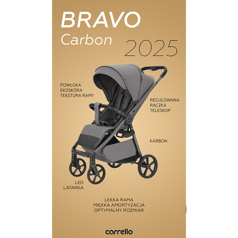 Wózek spacerowy Carrello Bravo Carbon to nowa odsłona popularnego modelu z udoskonalonym designem i nową kolorystyką. Model zachęca wyrazistymi kombinacjami materiałów. Wytrzymały, ultralekki karbon z charakterystycznym wzorem oraz matowe czarne, lśniące lub głębokie szare wykończenie aluminiowej ramy. Wózek Carrello Bravo Carbon składa się w prosty sposób na płasko, a po złożeniu stoi bez podparcia. Wygodny uchwyt do przenoszenia pozwala na bezproblemowe transportowanie. Centralny hamulec umieszczony jest na tylnej osi i został skonstruowany tak, aby był wygodny w obsłudze i nie niszczył butów. Wózek doskonale poradzi sobie na trudniejszym terenie dzięki dobrej amortyzacji i dużym bezobsługowym piankowym kołom. Przednie koła są skrętne z możliwością zablokowania do jazdy na wprost. Nowością jest lampka Led umieszczona na przedzie z trzema trybami świecenia: mocnym, średnim lub pulsacyjnym. Rączka obita ekoskórą jest regulowana teleskopowo.