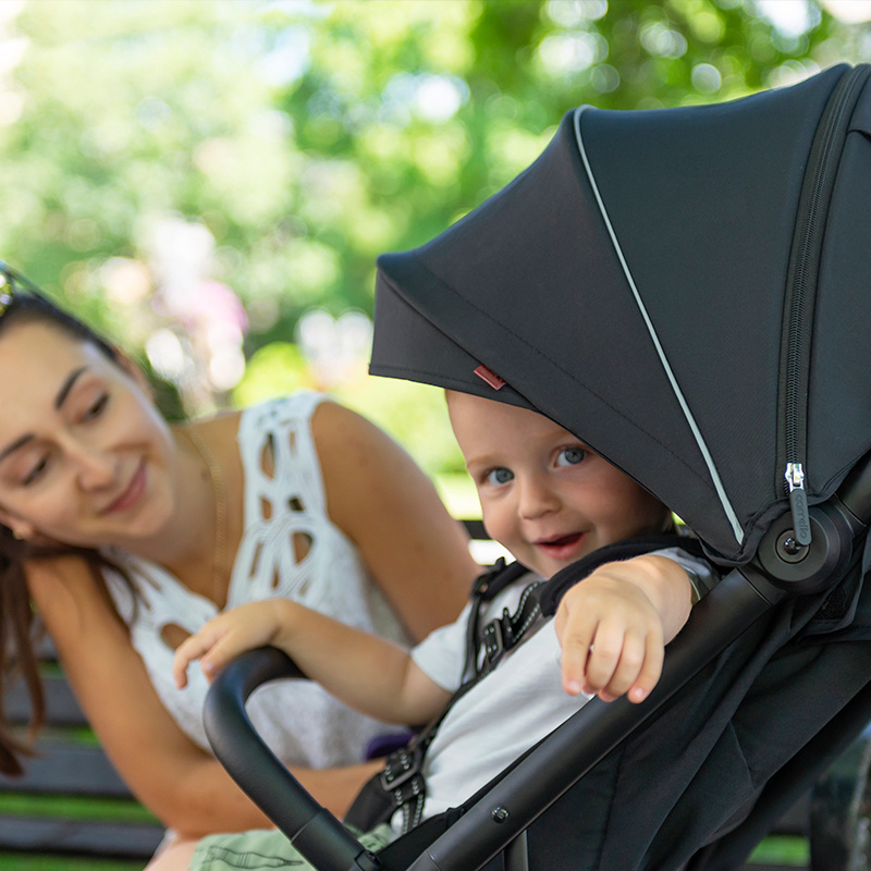 Siedzisko jest obszerne i wygodne. Posiada 5-punktowe pasy bezpieczeństwa z możliwością zmiany ich wysokości w zależności od wzrostu dziecka. Oparcie rozkłada się mechanicznie do pozycji leżącej. Podnóżek również jest regulowany i dzięki temu całkowite miejsce do snu ma 84 cm długości. Duża budka ma możliwość dodatkowego powiększenia za pomocą panelu ukrytego pod suwakiem. Z tyłu budki po rozłożeniu znajduje się okienko wentylacyjne, przez które można zajrzeć do dziecka. Pojemny kosz na zakupy pozwoli zmieścić w nim wszystkie niezbędne drobiazgi.
