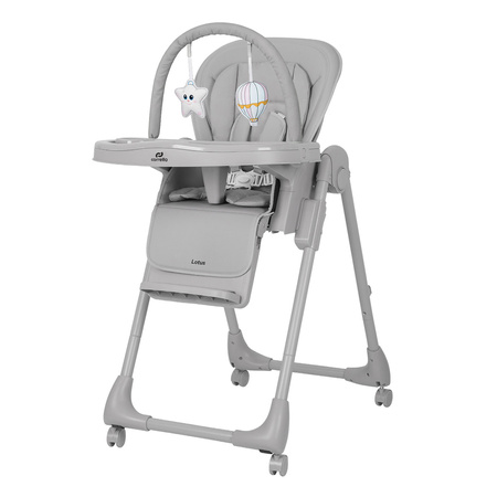 - Krzesełko do karmienia Carrello Lotus z funkcją leżaczka. Ma 6 poziomów wysokości, 3 pozycje oparcia, regulowany podnóżek, 5-punktowe pasy i 4 koła z blokadą. W zestawie miękka wkładka, wyjmowana tacka i pałąk z zabawkami.