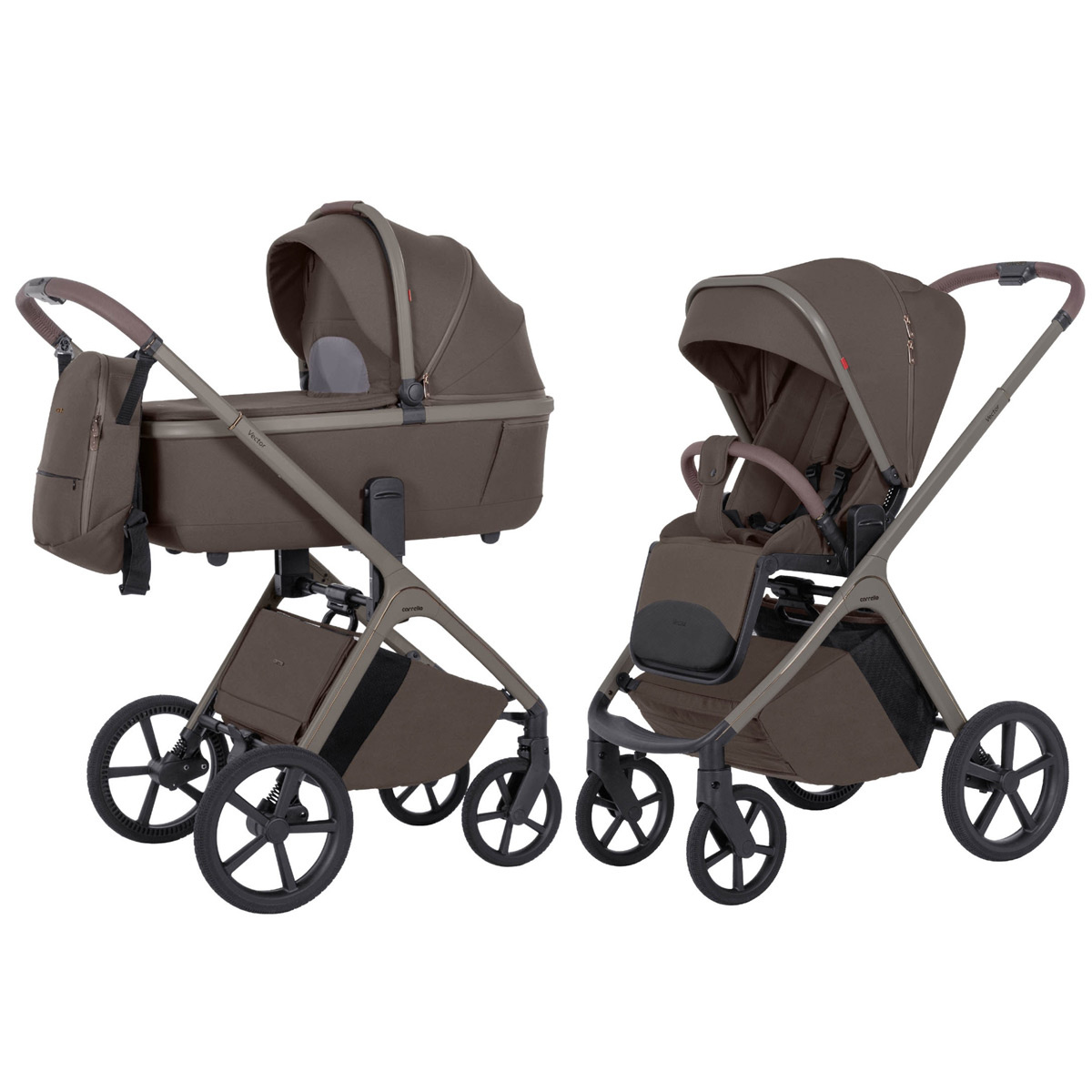 - Wózek 2w1 Carrello Vector CRL-6550, od urodzenia do 22 kg. Duże bezobsługowe koła, amortyzacja na wszystkie koła oraz siedzisko montowane przodem lub tyłem do kierunku jazdy.