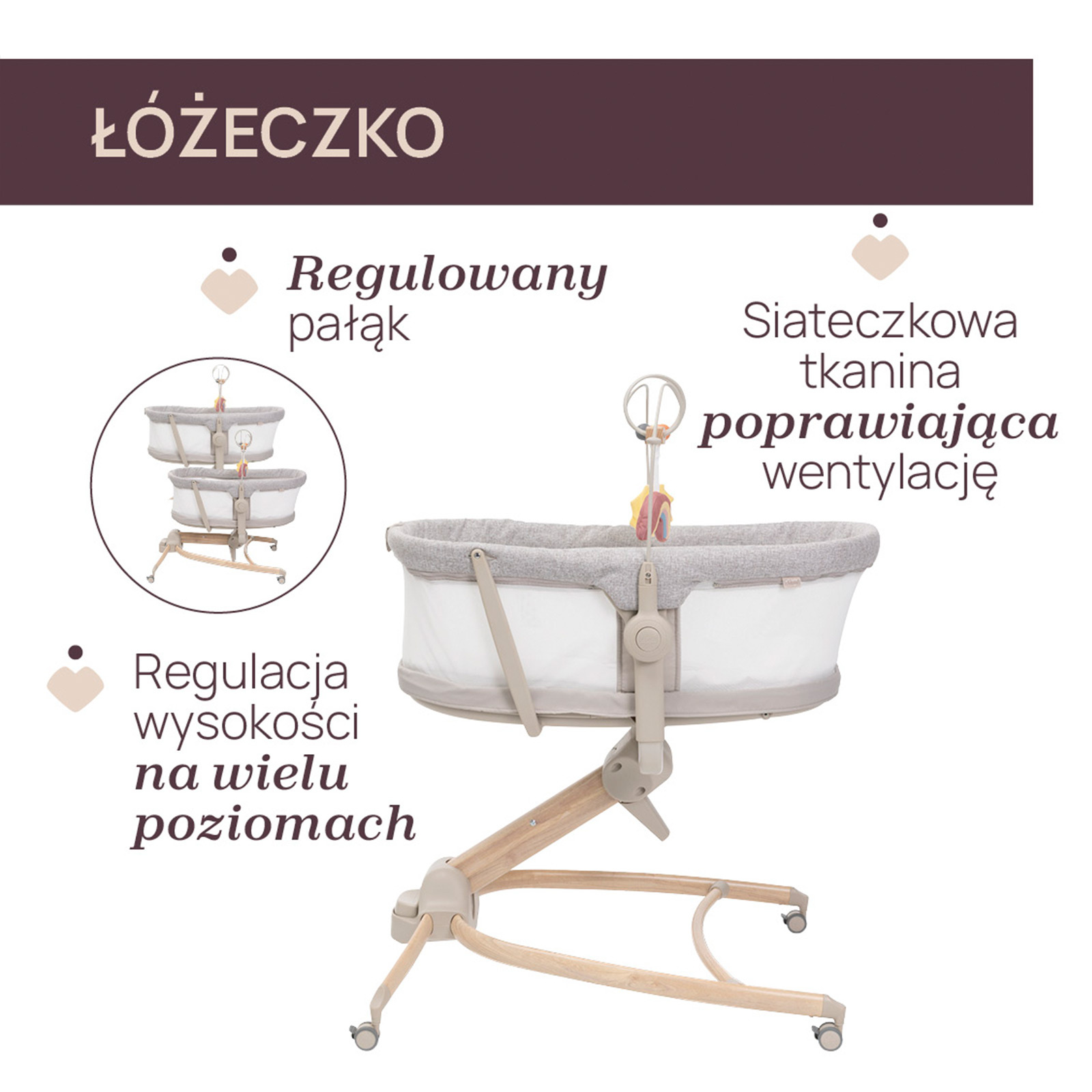 Produkt wyposażono w 4 kółka z hamulcami, dzięki czemu można łatwo przestawiać go w różne miejsca w domu. Pozycję siedziska reguluje się uchwytem w wezgłowiu łóżeczka. Dostępne są 3 poziomy ustawienia, co pomaga dopasować produkt do odpoczynku, zabawy lub karmienia. Taka regulacja bywa przydatna także wtedy, gdy dziecko ma katar lub skłonność do refluksu.