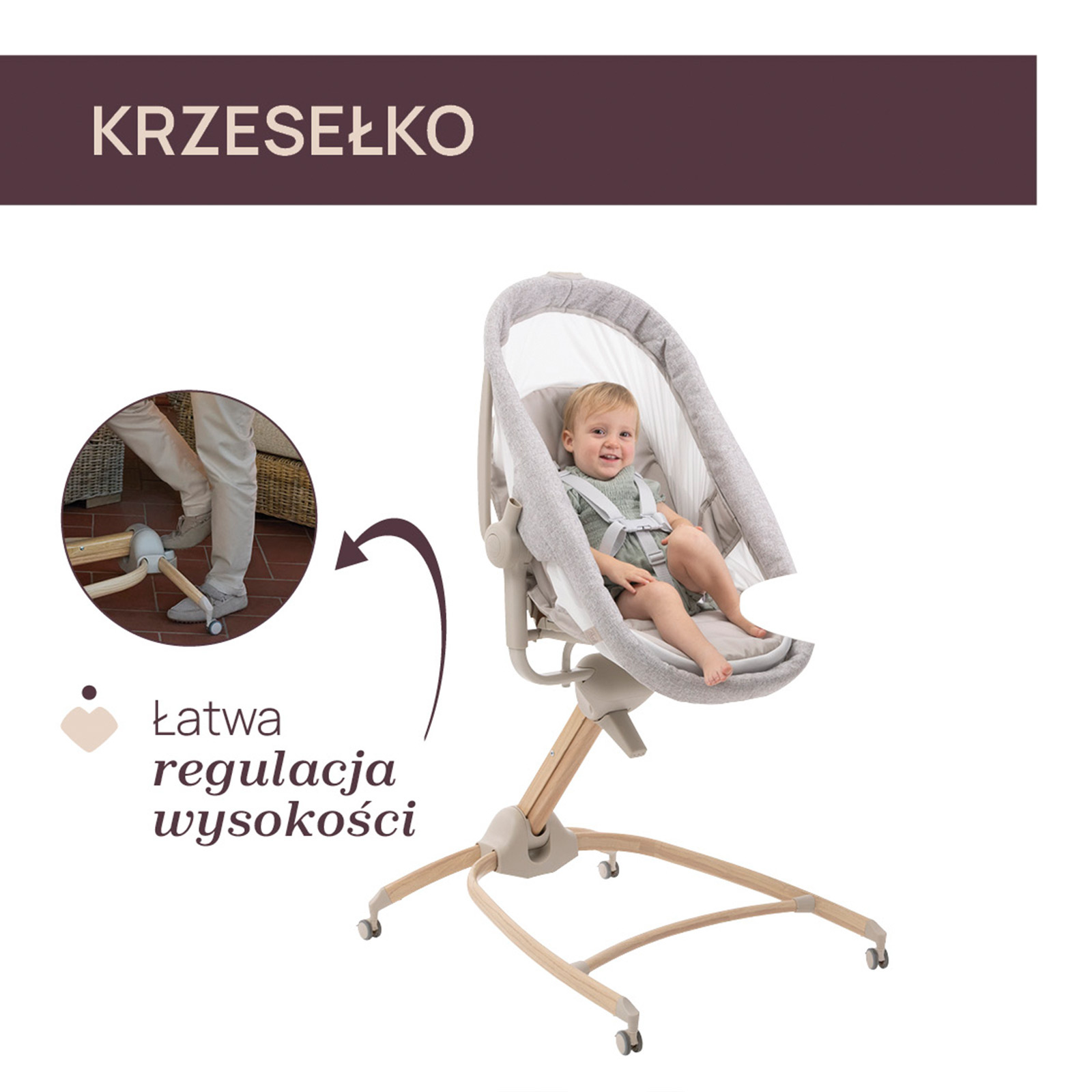• 3 poziomy ustawienia siedziska pomagają dopasować pozycję do odpoczynku, zabawy lub karmienia.