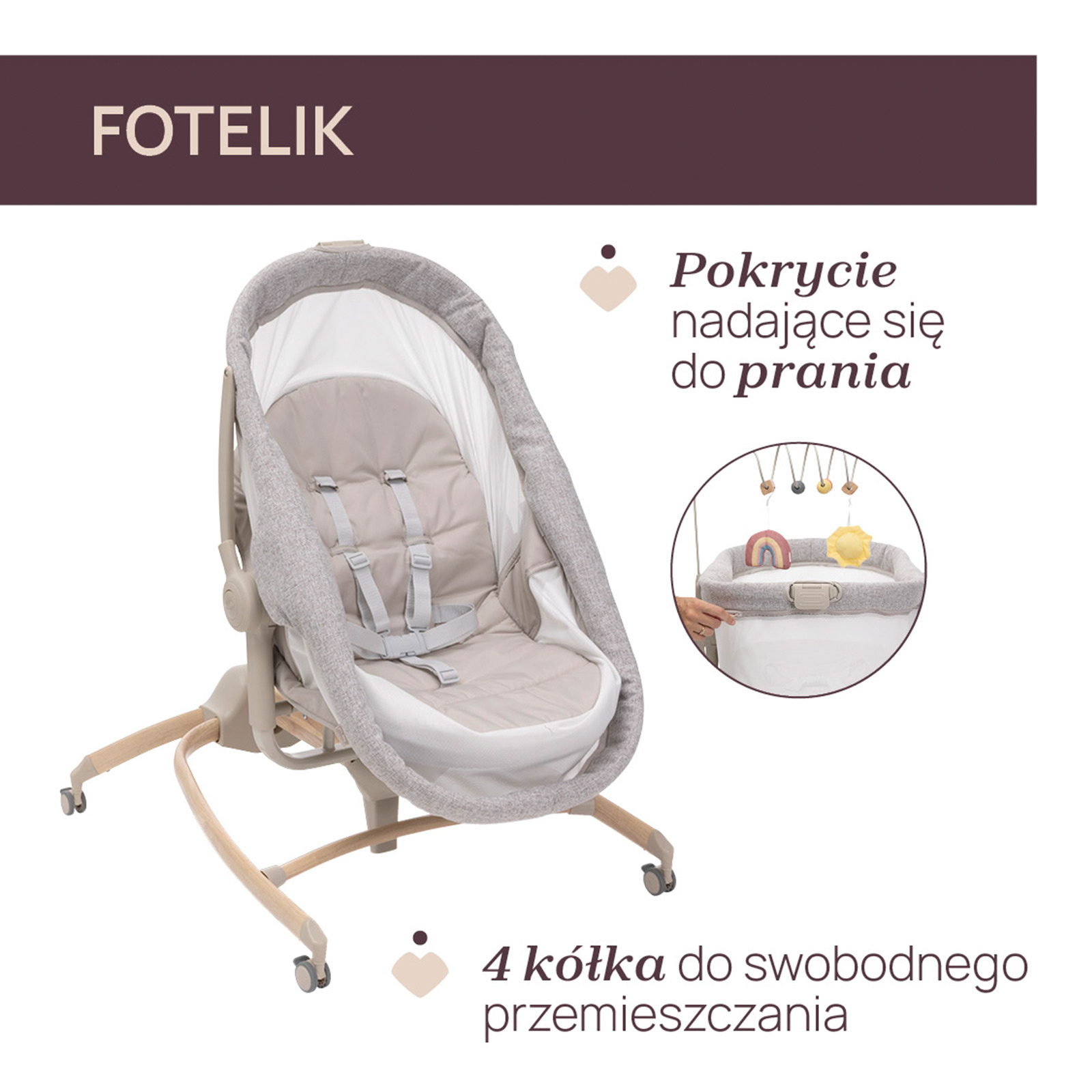 Model łączy 4 funkcje: łóżeczko, leżaczek, krzesełko do karmienia i pierwszy fotelik.