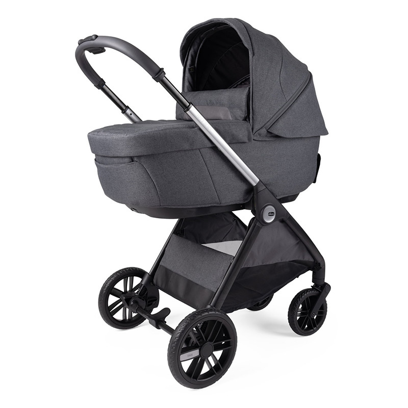 Chicco Bellagio, elegancki i kompaktowy zestaw 3w1 z przekładanym siedziskiem, gondolą Gran Comfort i fotelikiem Kory Plus. Rozwiązanie, które łączy klasyczny design z nowoczesnymi technologiami, zapewniając komfort i bezpieczeństwo malucha już od pierwszych dni życia. Przeznaczony jest dla dzieci od urodzenia do maksymalnej wagi 22 kg. Stelaż ma funkcję autofoldingu uruchamianego jednym ruchem, do pozycji wolnostojącej. Funkcję samo-składania można uruchomić zarówno z wpiętym siedziskiem spacerowym jak i na samym stelażu. Waga 9,7 kg oraz małe wymiary po złożeniu sprawią, że jest łatwy w transportowaniu i zmieści się w większości bagażników samochodowych. Piankowe koła są bezobsługowe i odporne na przebicia, wyposażone w amortyzatory i łożyska kulkowe. Przednie są skrętne z możliwością zablokowania do jazdy na wprost. Znacznie ułatwia to manewrowanie i poprawia zwrotność wózka. Centralny hamulec znajduje się na tylnej osi, działa na zasadzie jednego naciśnięcia i nie niszczy obuwia. Koszyk na zakupy zmieści wszystkie niezbędne na spacerze akcesoria, a jego tylna cześć jest zamykana na magnes. Rączka jest regulowana teleskopowo, co pozwoli dostosować ją wysokość do wzrostu opiekuna.
