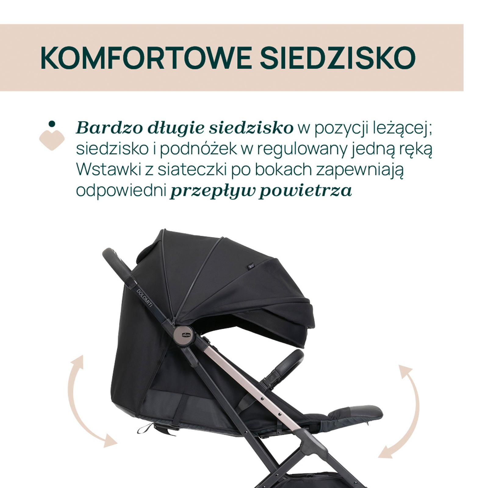 Chicco Dolomiti ma miękkie i szerokie siedzisko, które daje dziecku wygodne miejsce na codzienne spacery. Oparcie z przewiewnej siatki 3D oraz siatkowe wstawki po bokach wspierają cyrkulację powietrza przez cały rok. Oparcie i podnóżek można w pełni regulować jedną ręką, co ułatwia ustawienie pozycji odpowiedniej do obserwowania otoczenia albo spokojniejszego odpoczynku. Szybkie zapinanie pasów ułatwia magnetyczna klamra.