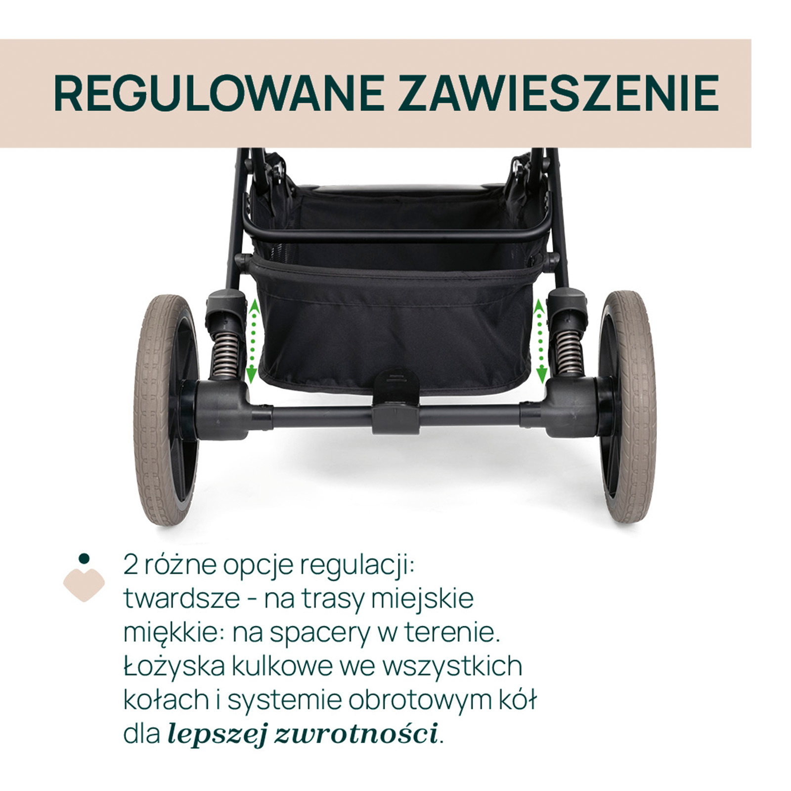 Najmocniejszą stroną tego modelu jest połączenie lekkiej obsługi z bardziej spacerowym charakterem. Duże gumowe koła, amortyzacja wszystkich kół i łożyska kulkowe pomagają zachować płynność jazdy. Tylne zawieszenie można ustawić w dwóch trybach: twardszym do miasta i miększym na drogi nieutwardzone. Dzięki temu łatwiej dopasować wózek do trasy, po której naprawdę jeździsz.