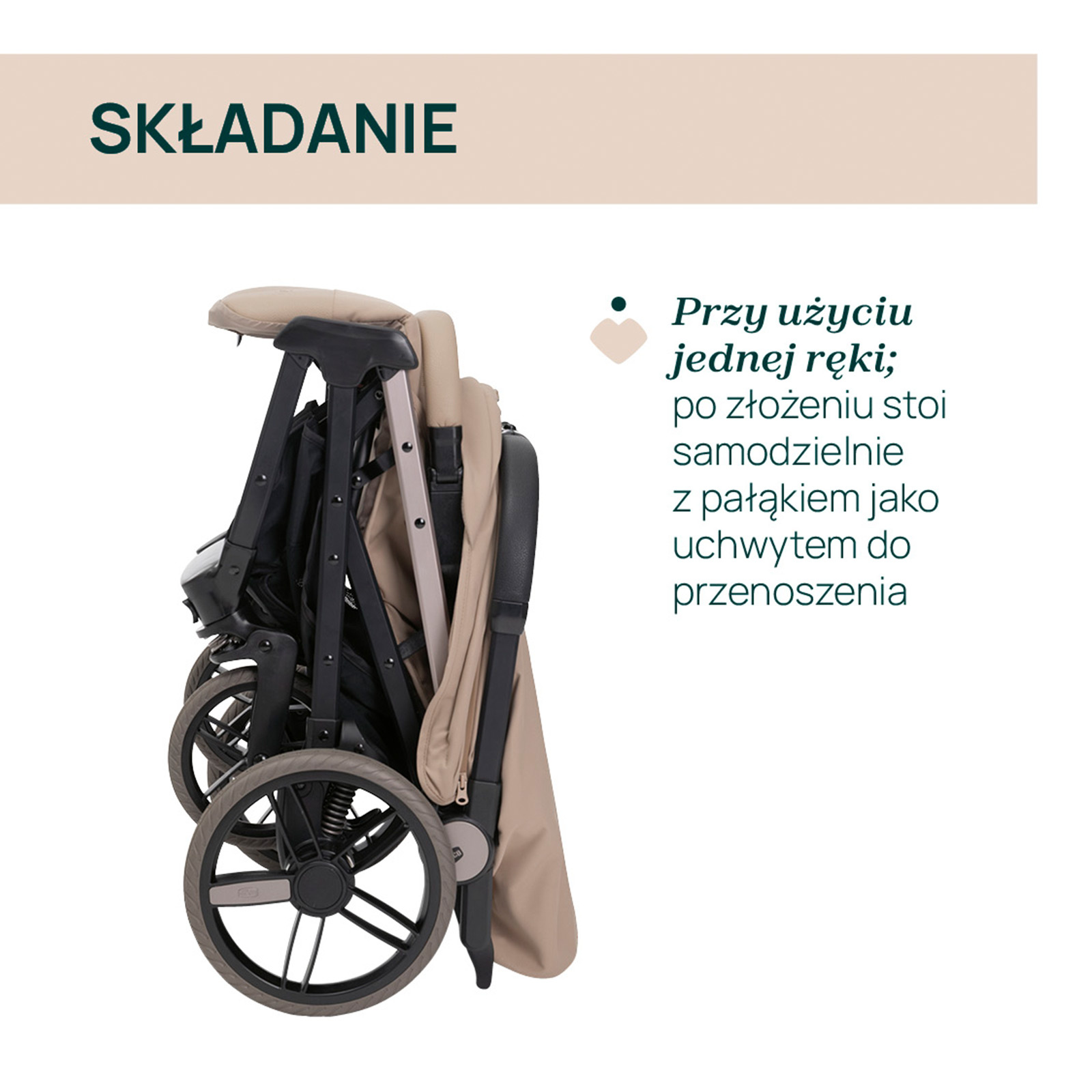 • składanie: jedną ręką, po złożeniu wózek stoi samodzielnie
