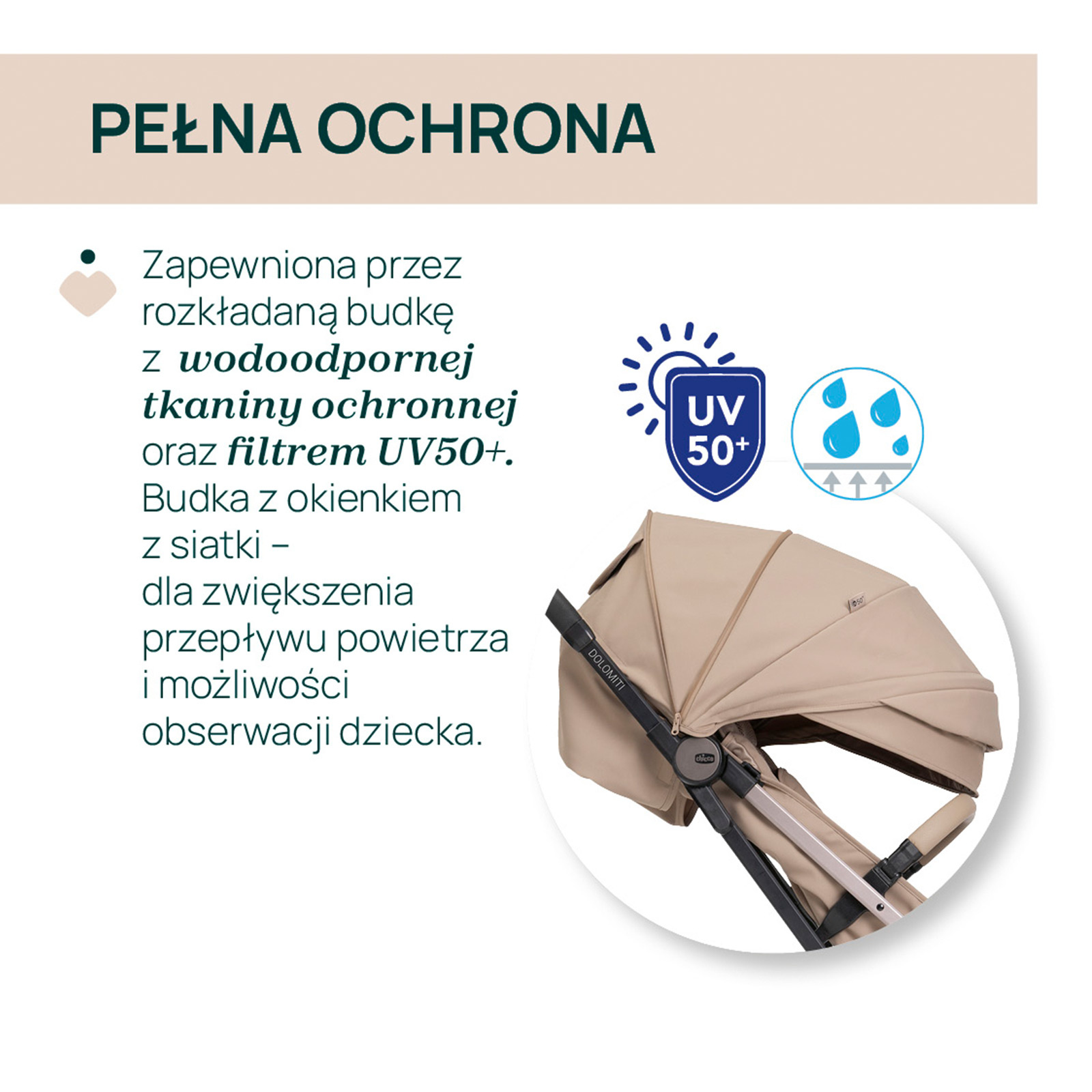 Duży, rozkładany daszek jest wodoodporny i ma filtr UV50+, więc lepiej osłania dziecko podczas spacerów w słońcu i przy zmiennej pogodzie. Dodatkowy zdejmowany daszek przeciwsłoneczny zwiększa zakres osłony, a okienko ułatwia szybkie zerkanie na dziecko bez zatrzymywania spaceru. W chłodne i deszczowe dni przydają się dołączone akcesoria ochronne.