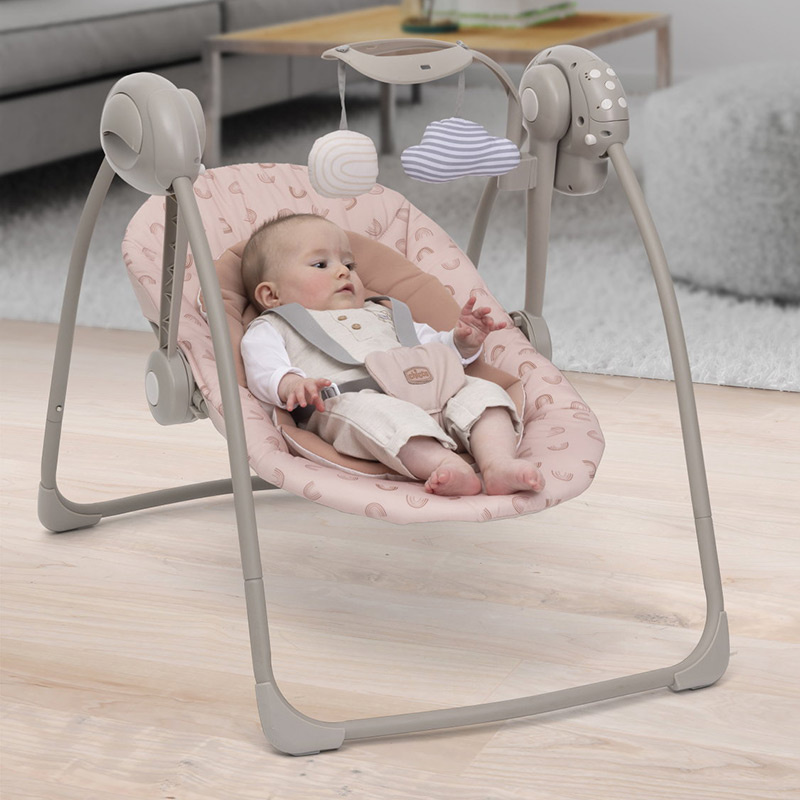Chicco Swing&Play, nowoczesna huśtawka stworzona z myślą o wygodzie dziecka i wsparciu rodzica. Przeznaczona jest dla dziecka od urodzenia, do uzyskania przez nie maksymalnie 9 kg. wagi. Miękka wkładka oraz 5-punktowe pasy wewnętrzne dbają o komfort i bezpieczeństwo dziecka. Huśtawka wyposażona jest w 12 relaksacyjnych melodii tworząc kojące tło, które pomaga wyciszyć maluszka i umilić czas zabawy. Dzięki 5 prędkościom bujania można dopasować rytm do potrzeb dziecka, od delikatnego kołysania idealnego do drzemki, po bardziej dynamiczny ruch w czasie aktywności.