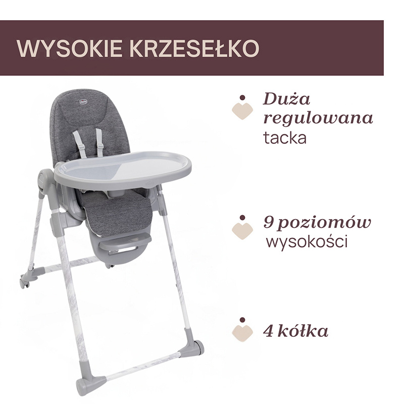 Chicco Polly Armonia, wygodne i nowoczesne krzesełko do karmienia. Zostało zaprojektowane tak, aby pasowało do wielu wnętrz, dzięki zastosowaniu różnych materiałów z jakich zostało wykonane siedzisko i rama krzesełka. Przeznaczone jest dla dzieci od urodzenia do maksymalnej wagi 40 kg. Liczne możliwości regulacji pozwalają na korzystanie z krzesełka na każdym etapie rozwoju dziecka. Jego smukła budowa oraz możliwość szybkiego złożenia do kompaktowych rozmiarów pozwala na łatwe przechowywanie. Polly Armonia jest niezwykle mobilne, wmontowane w stelaż kołka pozwalają na łatwe przemieszczanie.