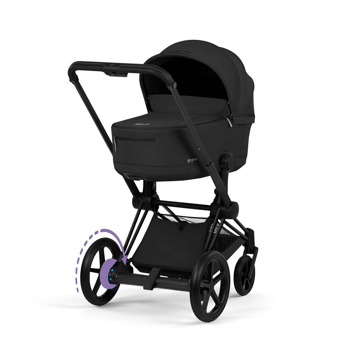 Cybex e-Priam wyróżnia się zintegrowaną technologią elektrycznego wspomagania. System został zaprojektowany tak, aby pomagać rodzicowi podczas pokonywania podjazdów oraz podczas spacerów po trudniejszych nawierzchniach. Dwa silniki umieszczone przy tylnej osi pracują cicho, a wózek może być obsługiwany również bez aktywnego wspomagania.
