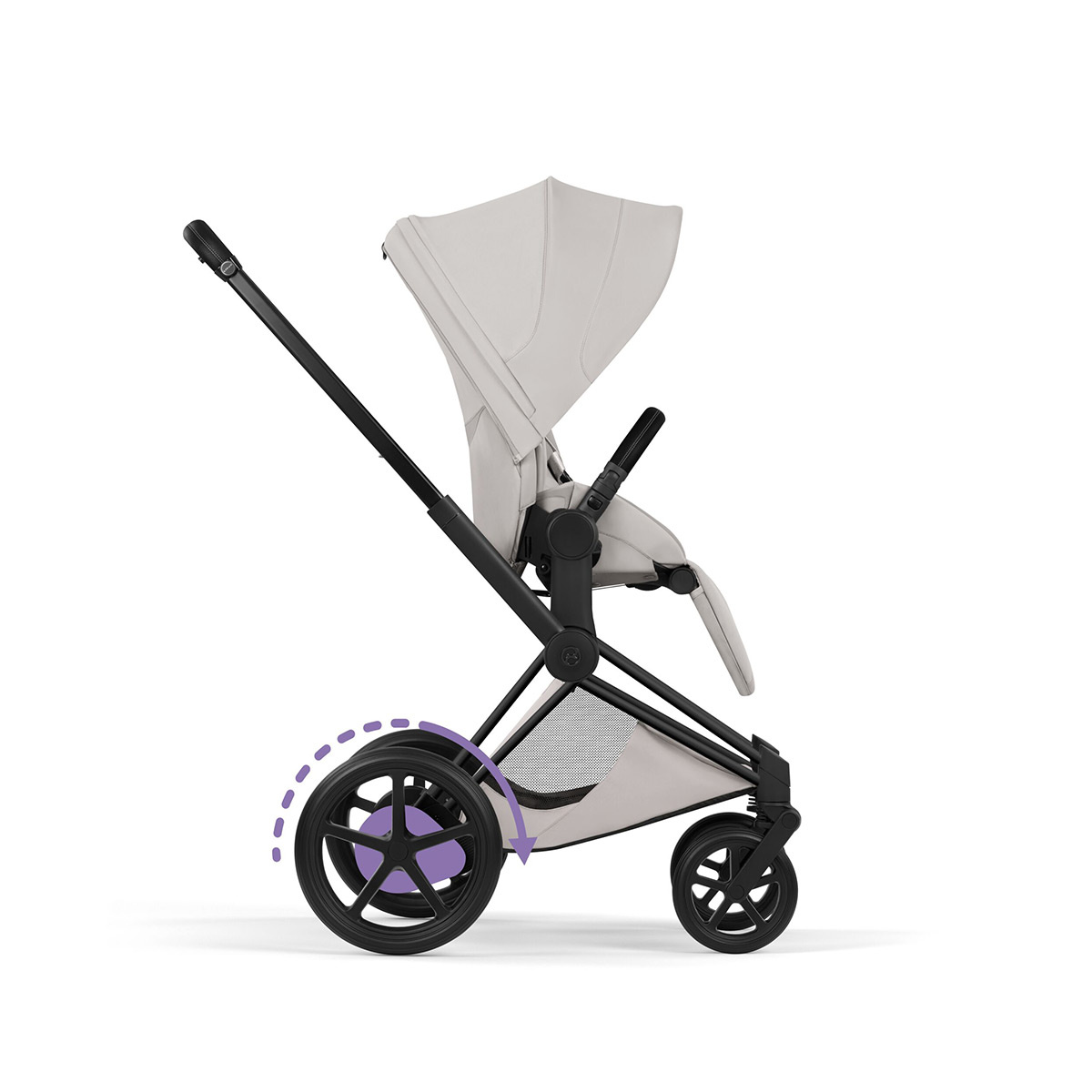 Rama e-Priam została wyposażona w dwa silniki elektryczne umieszczone przy tylnej osi. System reaguje na opór podczas jazdy i wspiera prowadzenie wózka na wzniesieniach oraz na trudniejszej nawierzchni. Producent potwierdza także tryb kołysania, obsługiwany przez aplikację Cybex po połączeniu Bluetooth. Siedzisko można rozłożyć do pozycji leżącej, a cały wózek złożyć jedną ręką. Przydatne w codziennym użytkowaniu są też odwracane siedzisko spacerowe, powiększony kosz na zakupy oraz rączka z regulacją wysokości jedną ręką.