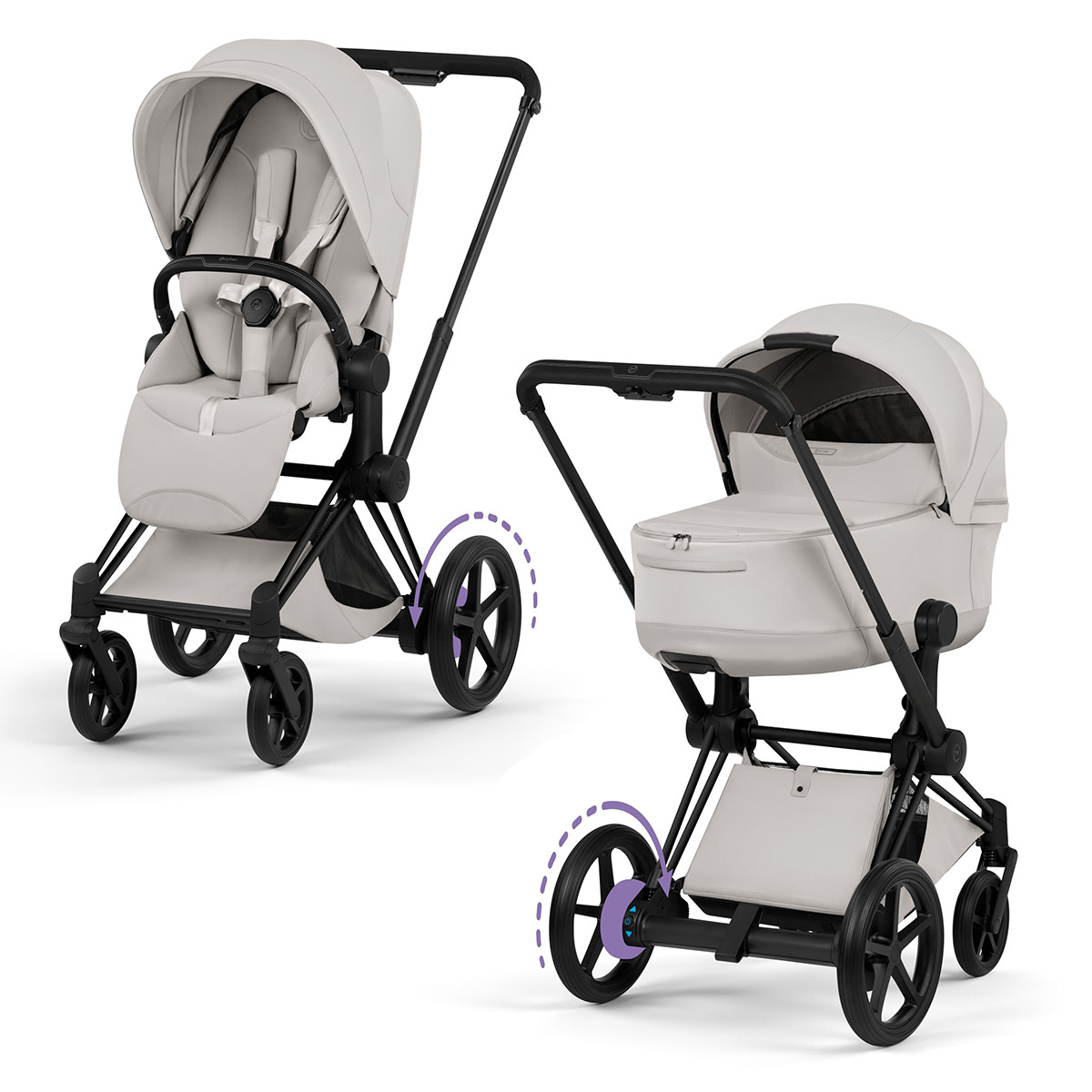 e-Priam jest systemem podróżnym. Producent potwierdza kompatybilność ramy z fotelikami samochodowymi dla niemowląt Cybex. W skład ramy wchodzą także adaptery do fotelika dla niemowląt, więc możesz rozbudować zestaw o funkcję podróżną zgodnie z potrzebami.