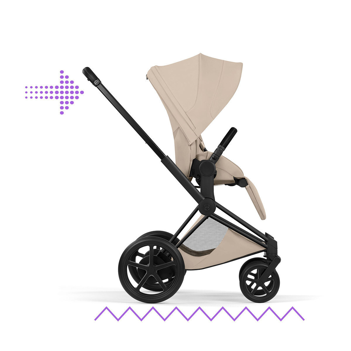 Rama e-Priam została wyposażona w dwa silniki elektryczne umieszczone przy tylnej osi. System reaguje na opór podczas jazdy i wspiera prowadzenie wózka na wzniesieniach oraz na trudniejszej nawierzchni. Producent potwierdza także tryb kołysania, obsługiwany przez aplikację Cybex po połączeniu Bluetooth. Siedzisko można rozłożyć do pozycji leżącej, a cały wózek złożyć jedną ręką. Przydatne w codziennym użytkowaniu są też odwracane siedzisko spacerowe, powiększony kosz na zakupy oraz rączka z regulacją wysokości jedną ręką.