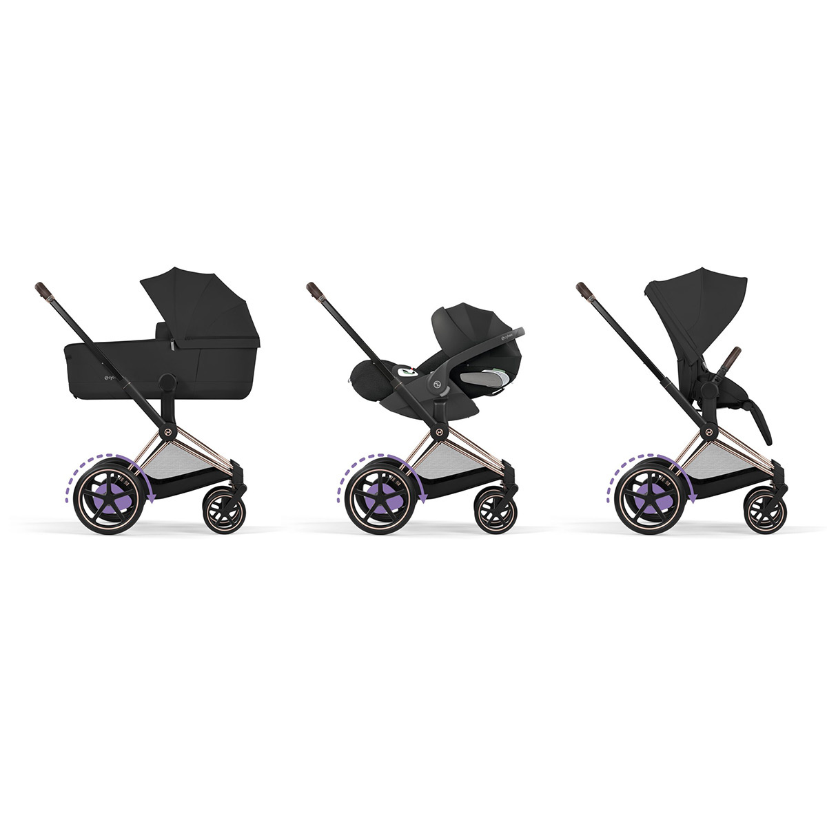 Cybex e-Priam 3w1 z Cloud T i-Size to zestaw dla rodziców, którzy chcą korzystać z jednego systemu od pierwszych dni życia dziecka. Łączy stelaż e-Priam z siedziskiem spacerowym, gondolą oraz fotelikiem samochodowym dla niemowląt Cloud T i-Size. Najważniejszym wyróżnikiem modelu jest elektryczne wspomaganie jazdy, które pomaga podczas podjazdów i na nierównych nawierzchniach, a możliwość korzystania z fotelika także na stelażu ułatwia codzienne przejścia między autem a spacerem.