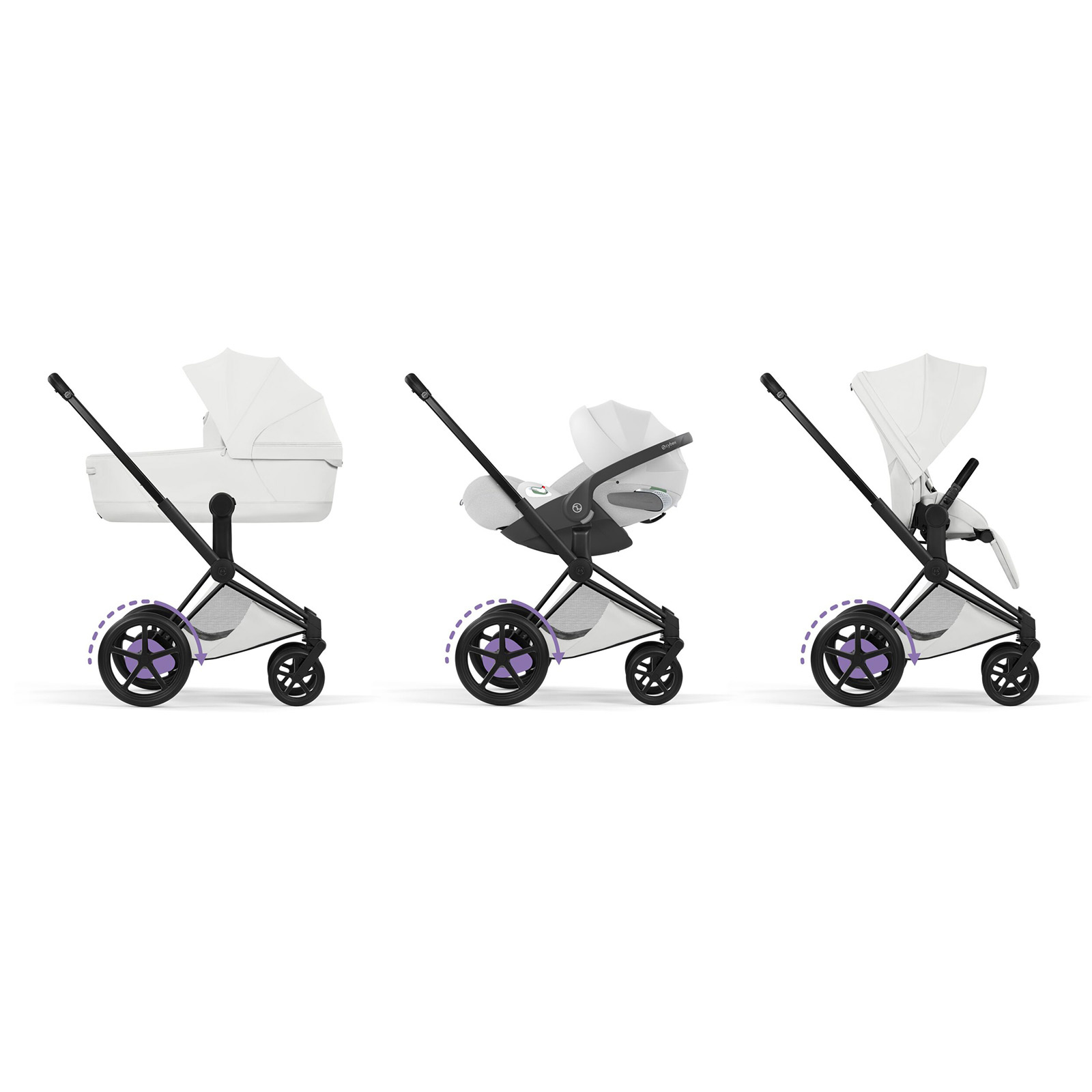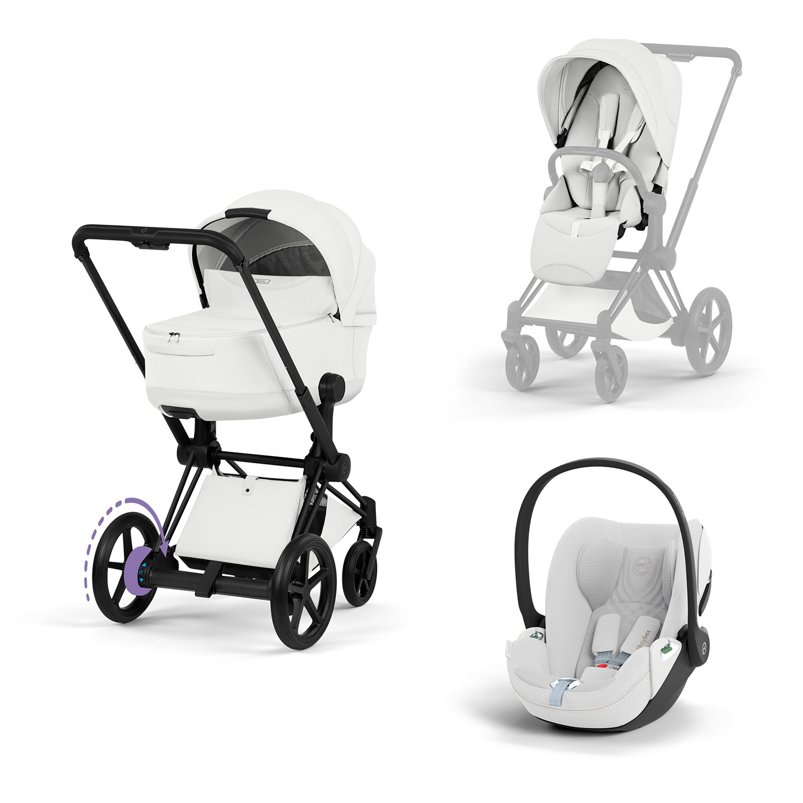- Wózek 3w1 CYBEX e-Priam Style Collection od urodzenia do ok. 4 lat i 22 kg, z elektrycznym wspomaganiem podjazdów, trybem kołysania w aplikacji oraz fotelikiem Cloud T i-Size.