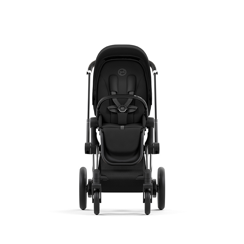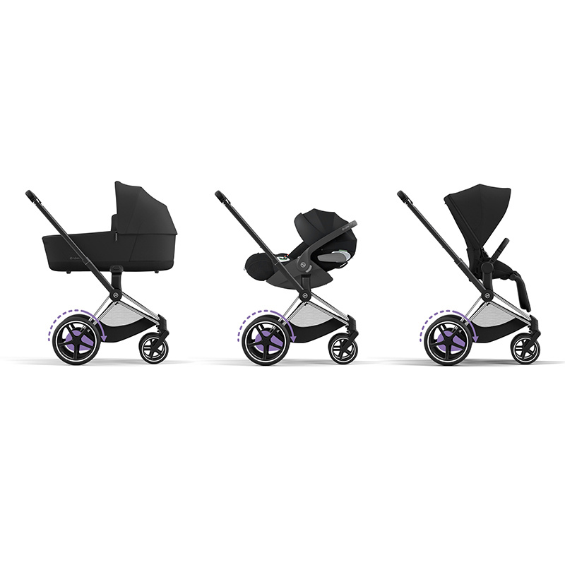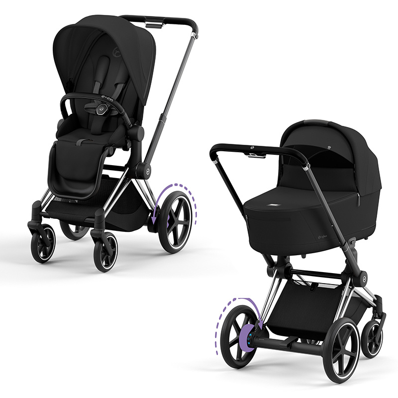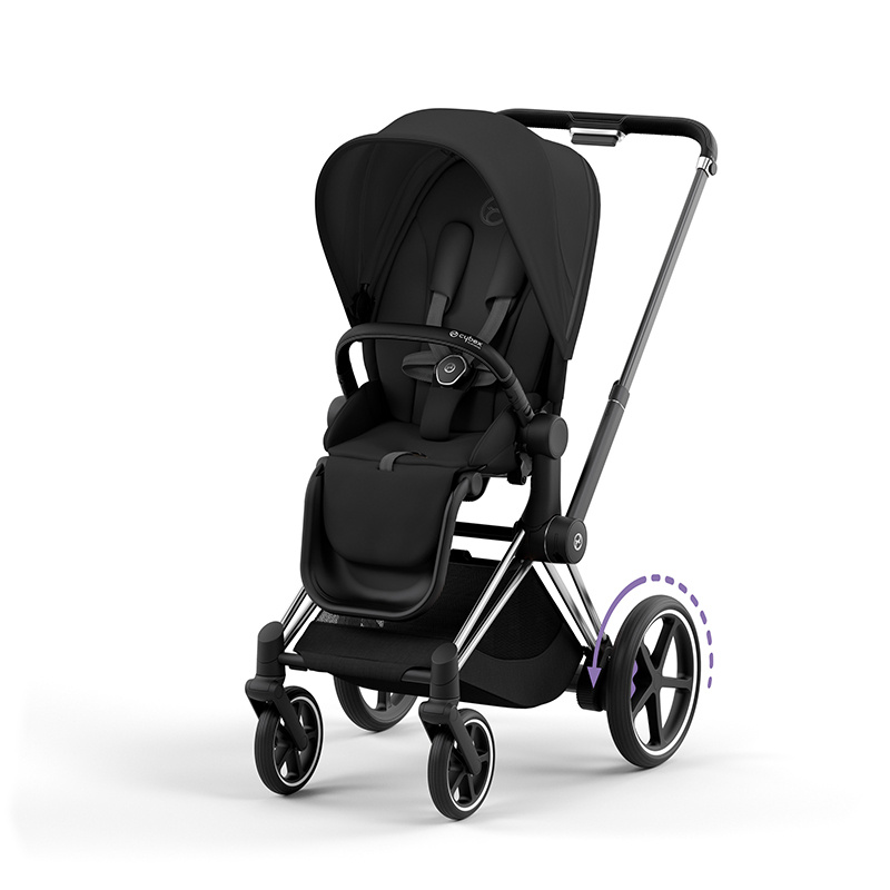 Wózek Cybex ePriam składany jest na płasko w prosty i intuicyjny sposób. Wszystkie koła są amortyzowane, bezobsługowe, odporne na przebicia i ścieranie. Tylne, większe koła ułatwiają podbijanie i pokonywanie przeszkód. Przednie koła są mniejsze, skrętne z możliwością zablokowania do jazdy na wprost, dzięki temu wózkiem łatwo się manewruje. Stelaż Cybex ePriam można przekształcić do jazdy w trybie dwukołowym co pozwala na jeszcze łatwiejsze pokonywanie przeszkód w trudnym terenie. Pojemny kosz pomieści zakupy i akcesoria dziecięce. Na ramie wózka bez dokupienia dodatkowych adapterów można zamocować fotelik samochodowy Cybex.