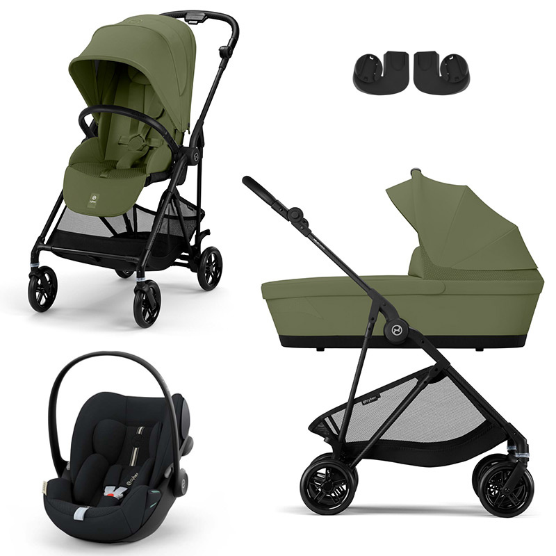 Zestaw 3w1, wózek Cybex Melio z fotelikiem Cybex Cloud G Plus i adapterami niezbędnymi do zamontowania fotelika na stelażu wózka.