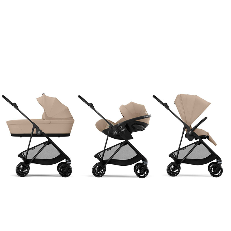 • na ramę spacerówki można wpiąć gondolę Cybex Melio Cot, miękką gondolę Cocoon S oraz fotelik samochodowy dla niemowlaka Cybex;