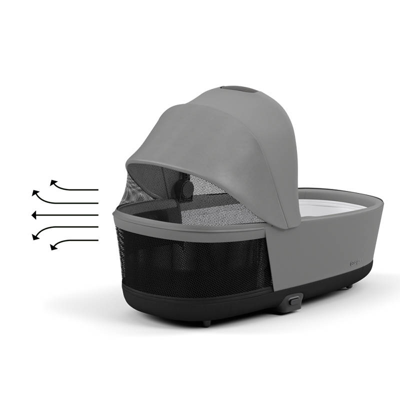 Gondola Cybex jest lekka, dużą w środku, a dzięki wbudowanemu uchwytowi łatwo ja przenosić. Na ramie wózka zamocowana jest wyżej i ma bardziej płaskie ułożenie, dzięki temu noworodek ma zapewnioną lepsza pozycję podczas spacerów. Gondola Lux mocowana jest na ramie w prosty i intuicyjny sposób, na adapterach podwyższających, te adaptery można również wykorzystać do wpięcia fotelików samochodowych dla niemowląt na ramę wózka. Gondola jest przeznaczona dla dziecka od urodzenia do 9 kg (ok. 6 miesięcy).