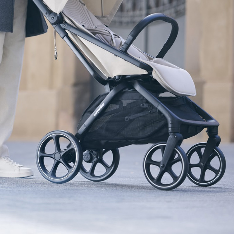 Easywalker Rockey L, średniej wielkości i prosty w obsłudze wózek spacerowy. Przeznaczony jest dla dzieci od urodzenia (po dokupieniu gondoli) do maksymalnej wagi 22 kg. Dzięki swojej małej wadze (9kg) i kompaktowym rozmiarom po złożeniu jest niezastąpiony w podróżach. System autofoldingu pozwala złożyć wózek szybko i sprawnie, a także rozłożyć go jednym kliknięciem. Duże, piankowe koła są odporne na przebicie i całkowicie bezobsługowe. Dzięki skrętnym przednim kołom manewrowanie w miejskich uliczka również nie będzie problemem. Dodatkowo, wszystkie koła posiadają samodzielną amortyzację, co znacznie poprawia komfort jazdy. Hamulec umieszczony jest w tylnej części wózka. Pojemny kosz na zakupy pomieści pakunki o łącznej wadze 7 kg.