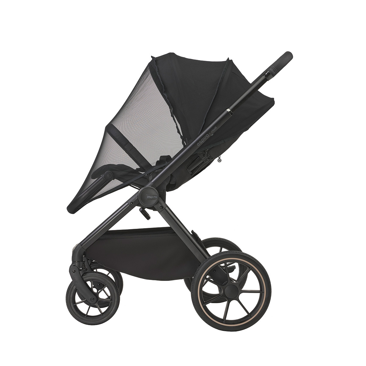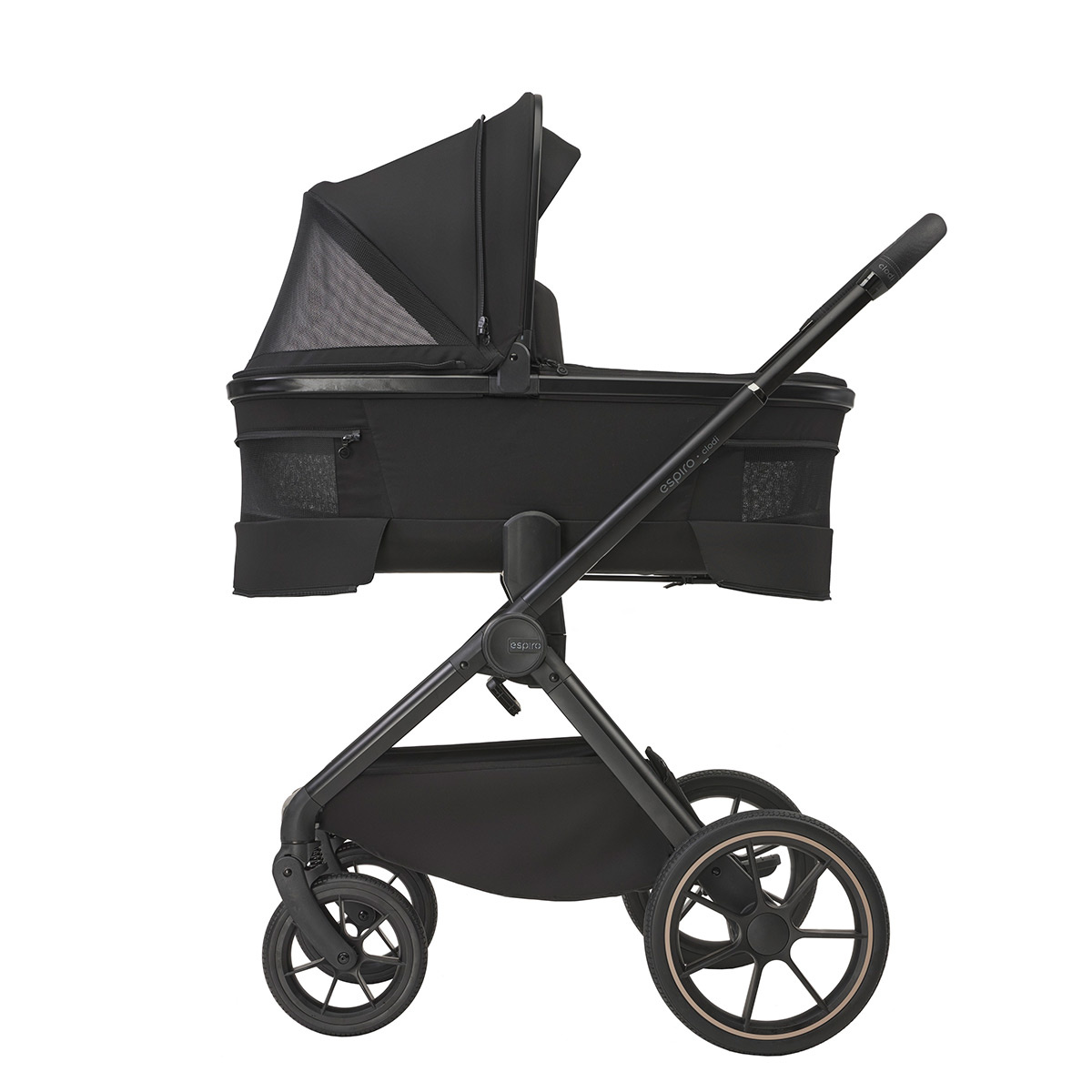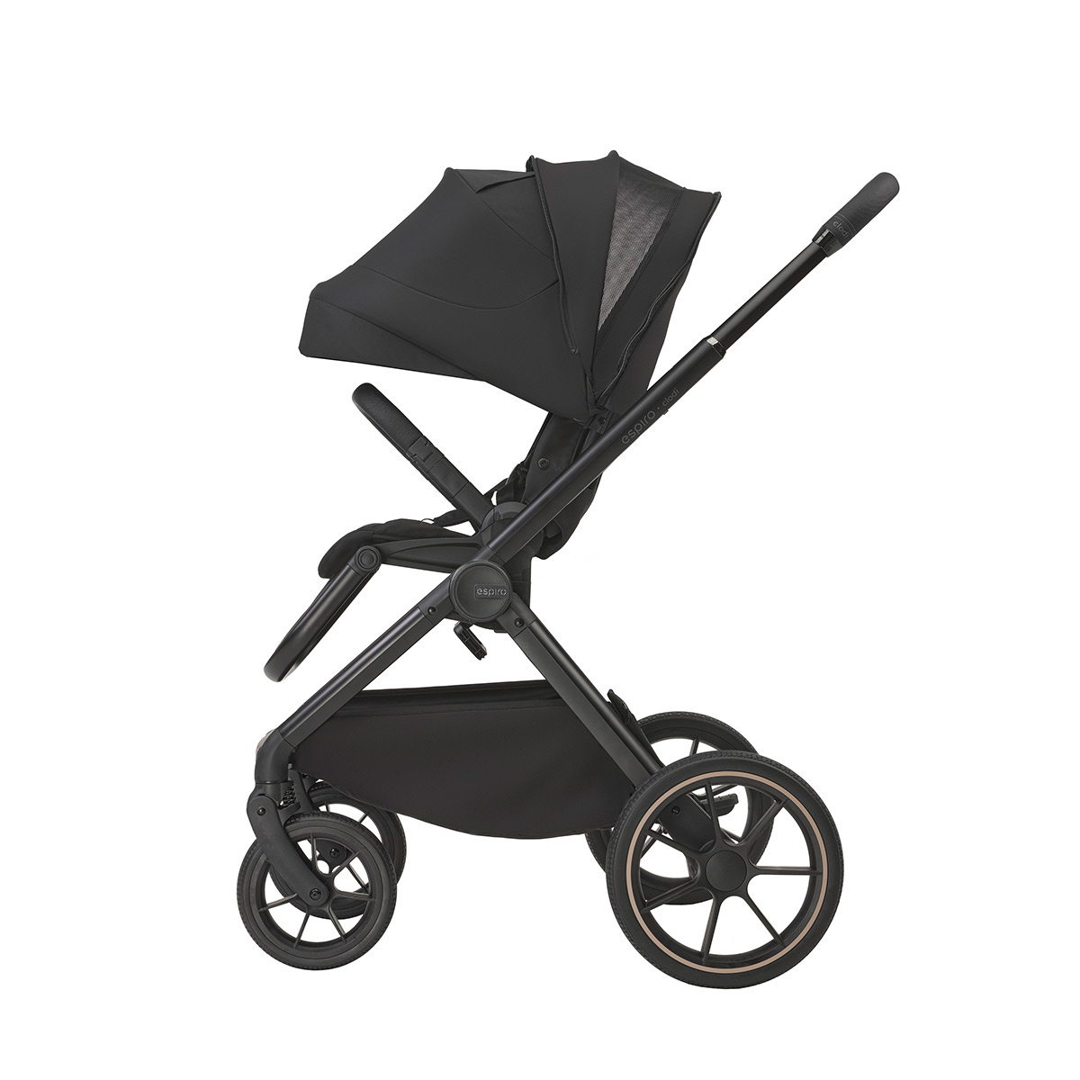 - Wózek 2w1 Espiro Clodi – gondola 3,4 kg z potrójną wentylacją, koła żelowe (20,5/29 cm) z amortyzacją i stabilizatorem drgań gondoli, oparcie na płasko, pasy z magnetyczną klamrą, budka poszerzana, hamulec One-Touch-Brake, składanie jedną ręką, do 22 kg.
