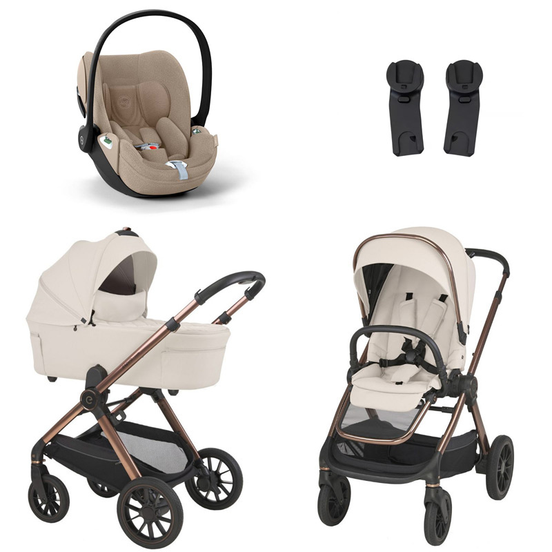 Zestaw wózek Espiro Code z fotelikiem Cybex Cloud T Plus i adapterami niezbędnymi do zamontowania fotelika na stelażu wózka.