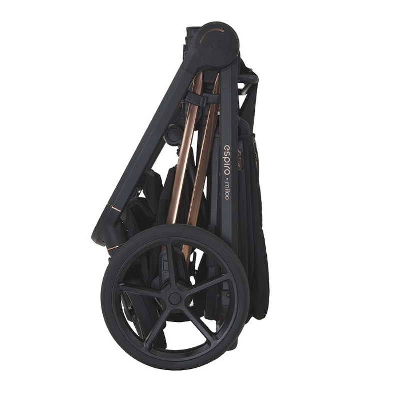 Stelaż Miloo Way jest bardzo lekki, waży jedynie 7,4 kg. Pozwala wozić dzieci do maksymalnej wagi 22 kg. Rama wózka jest wykonana z precyzją charakterystyczną dla ponadczasowych rozwiązań. Wózek posiada bezobsługowe koła, odporne na przebicie z bieżnikiem zapewniającym pewność prowadzenia. Przednie skrętne koła ułatwiają manewrowanie, a gdy zajdzie taka potrzeba można je zablokować do jazdy na wprost. Amortyzacja jest bardzo wydajna, wózek sprawdza się idealnie na każdym terenie. Rączka jest regulowana teleskopowo, wykonana z najlepszych jakościowo materiałów. Espiro Miloo Way ma prosty system składania do kompaktowych rozmiarów z siedziskiem spacerowym lub oddzielnie. System lift and go ułatwia przenoszenie złożonego stelaża na ramieniu. Kosz pod stelażem pomieści wszystkie niezbędne na spacerze drobiazgi. Hamulec umieszczony przy prawym kole jest prostu w użyciu i nie niszczy obuwia.