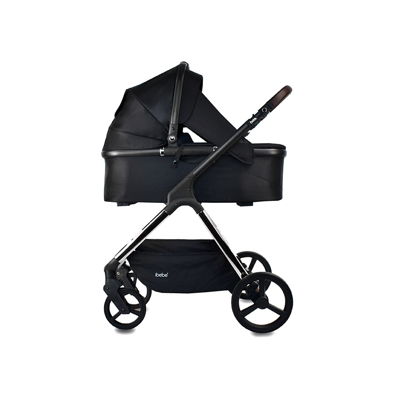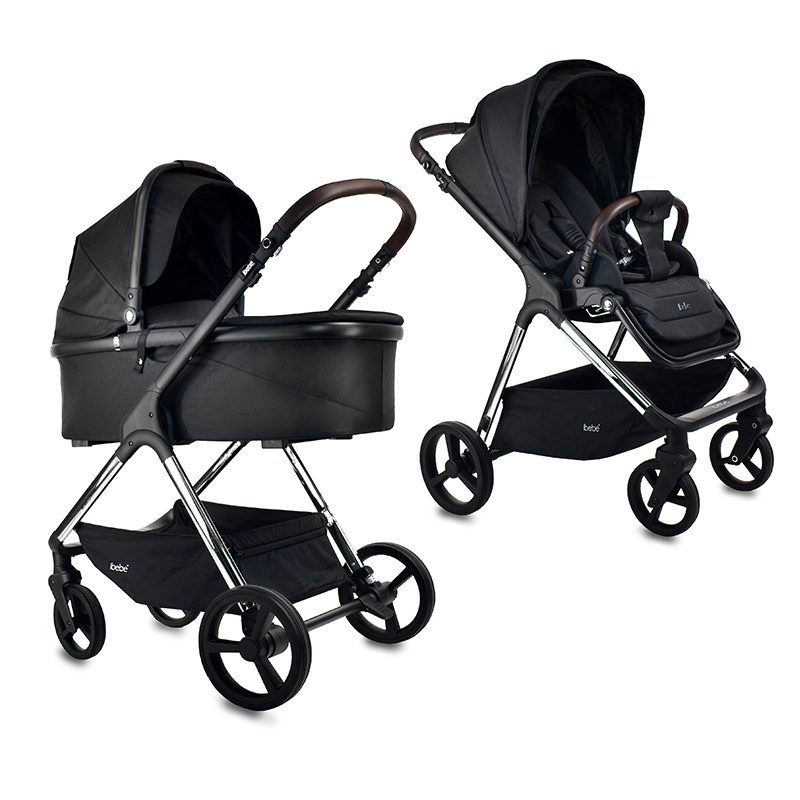 Nowoczesny i elegancki wózek dziecięcy dla noworodka ibebe ICE. Wózek ibebe Ice występuję w kilku kolorach tapicerek oraz w 3 kolorach stelaża: złoty, srebrny chromowany oraz czarny. Każdy rodzić może dopasować odpowiedni kolor do swojego stylu. iBebe ICE sprawdzi się w każdym terenie, wszystkie koła są bezobsługowe, amortyzacja jest miękka. Przednie koła są skrętne z możliwością blokady do jazdy na wprost. Wysokość raczki jest regulowana. W wózku ibebe Ice jest możliwość wpięcia gondoli, spacerówki i fotelika samochodowego przodem lub tyłem do kierunku jazdy.